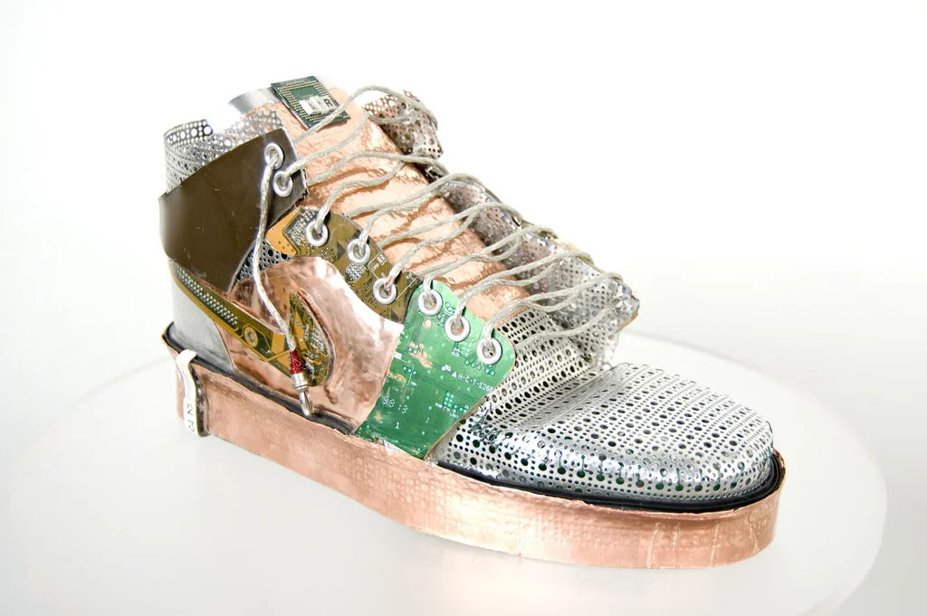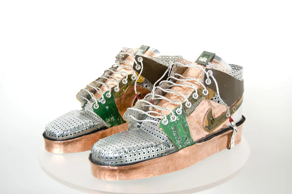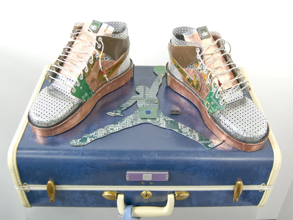 KEY FEATURES:· Extra pair of steal braided shoe laces. · Copper midsole for extra durability. · Premium Luggage unit for secure transportation and display. · Shoes fasten into box for secure lockdown when transporting. · Upper made from 70's era hard drive. · Outer sole made from motherboards for increased durability and data transfer.