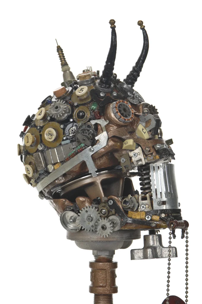 MATERIALS USED: airplane cargo wheels, adding machine keys, typewriter components, gears, hard drive motors, money counter gears, check printing machine parts, and computer chips.