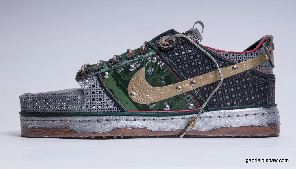 DESCRIPTION AND DETAILS: This sculpture is part of a shoes series I'm working on where I revisit some of my favorite classic sneaker silhouettes. Materials Used: Tin, Circuit Boards, Gears, Heat Sinks, Wire, Typewriter parts, Adding Machine parts and Metal Grate. STATUS: Sold