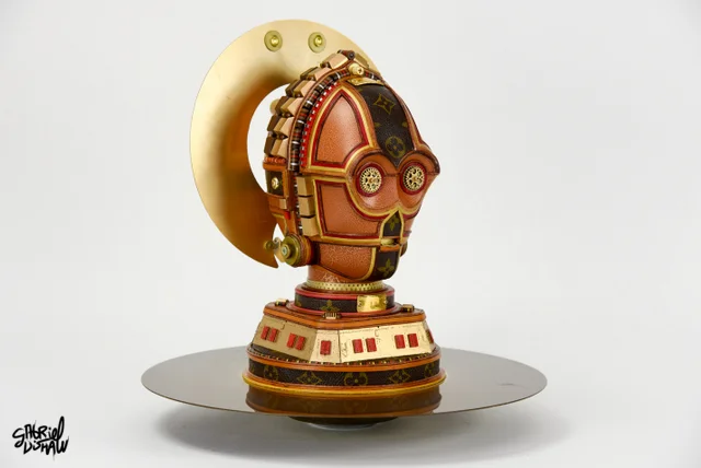 This upcycled C3PO was inspired/modeled after the iconic Luxury Brand Louis Vuitton and was created using a vintage piece of LV luggage.
