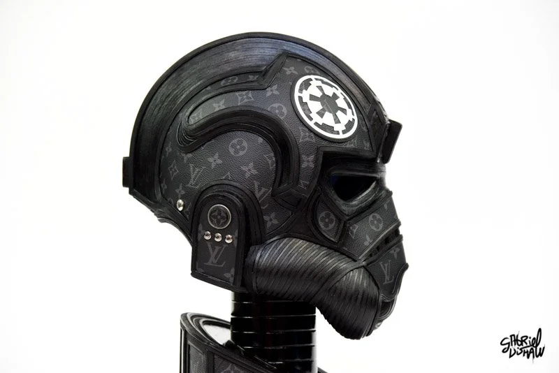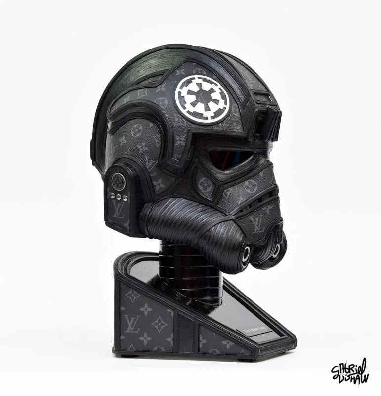 Golden Scars of the Empire is a reimagined Imperial Guard helmet that blends the worlds of pop culture, luxury, and philosophy. Constructed from upcycled designer materials, this piece is elevated through the influence of kintsugi—the Japanese art of repairing with gold, where fractures and imperfections become a source of strength and beauty.