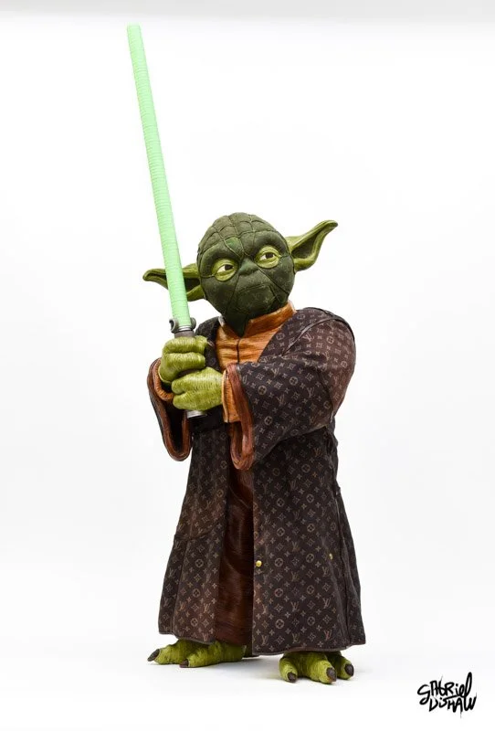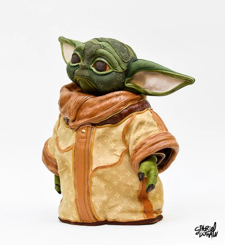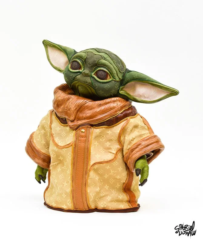 Grogu Luxe, my latest sculpture blending the craftsmanship of Louis Vuitton with the charm of Grogu. Crafted from upcycled luxury materials, his life-sized piece stands 14.5 inches tall and is a continuation in a series where I explore iconic characters from the Star Wars world at the intersection of high fashion.