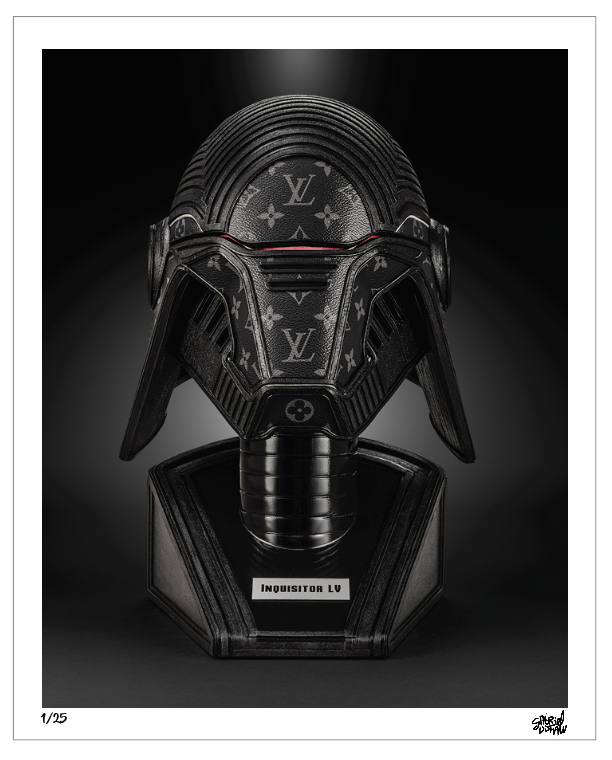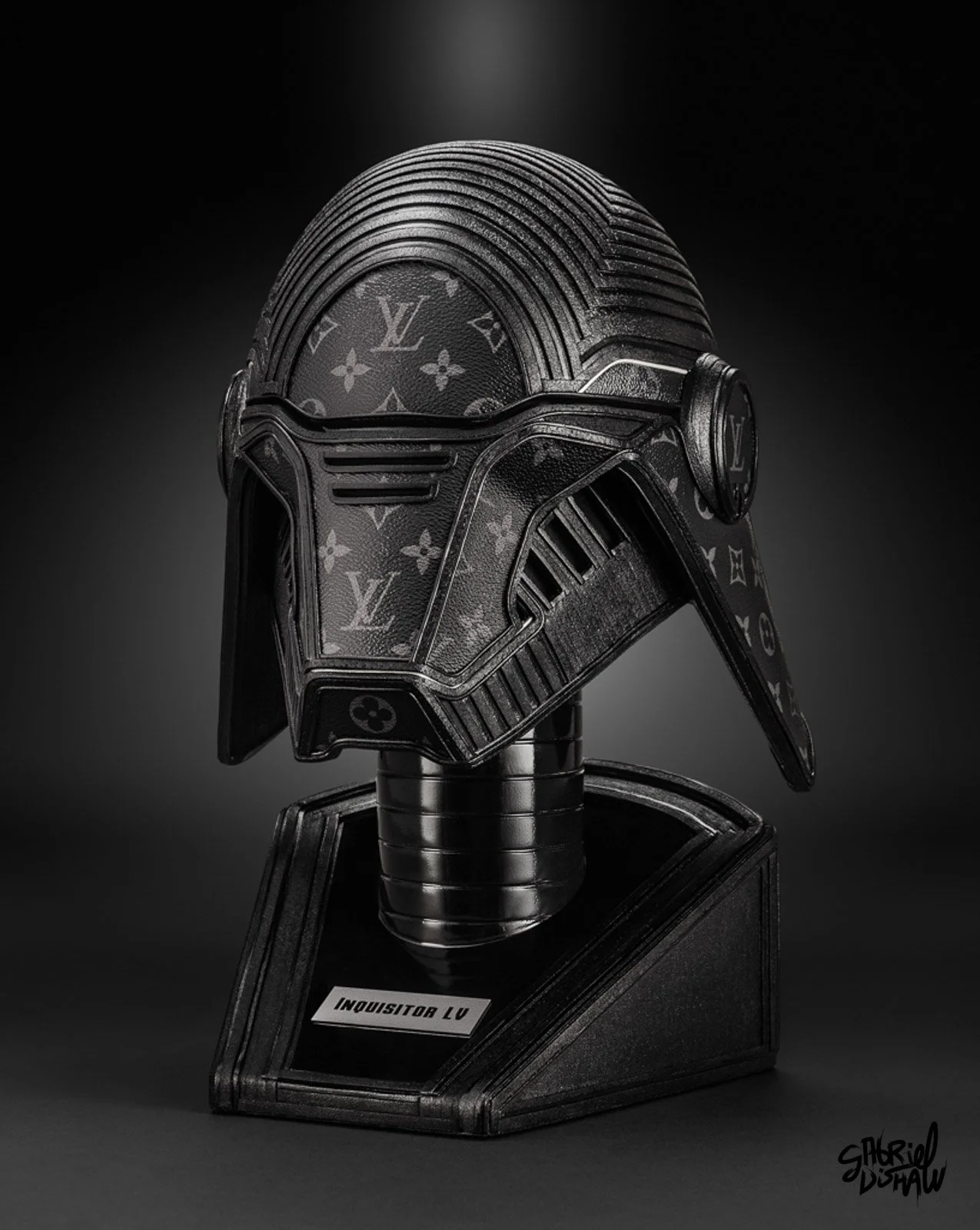 Inquisitor LV - draws inspiration from the Seventh Sister — the cunning and relentless Jedi hunter from Star Wars: Jedi Fallen Order. Handcrafted by Gabriel Dishaw using authentic upcycled Louis Vuitton materials and found components, this sculpture transforms the dark elegance of the Inquisitor into a piece of couture art.