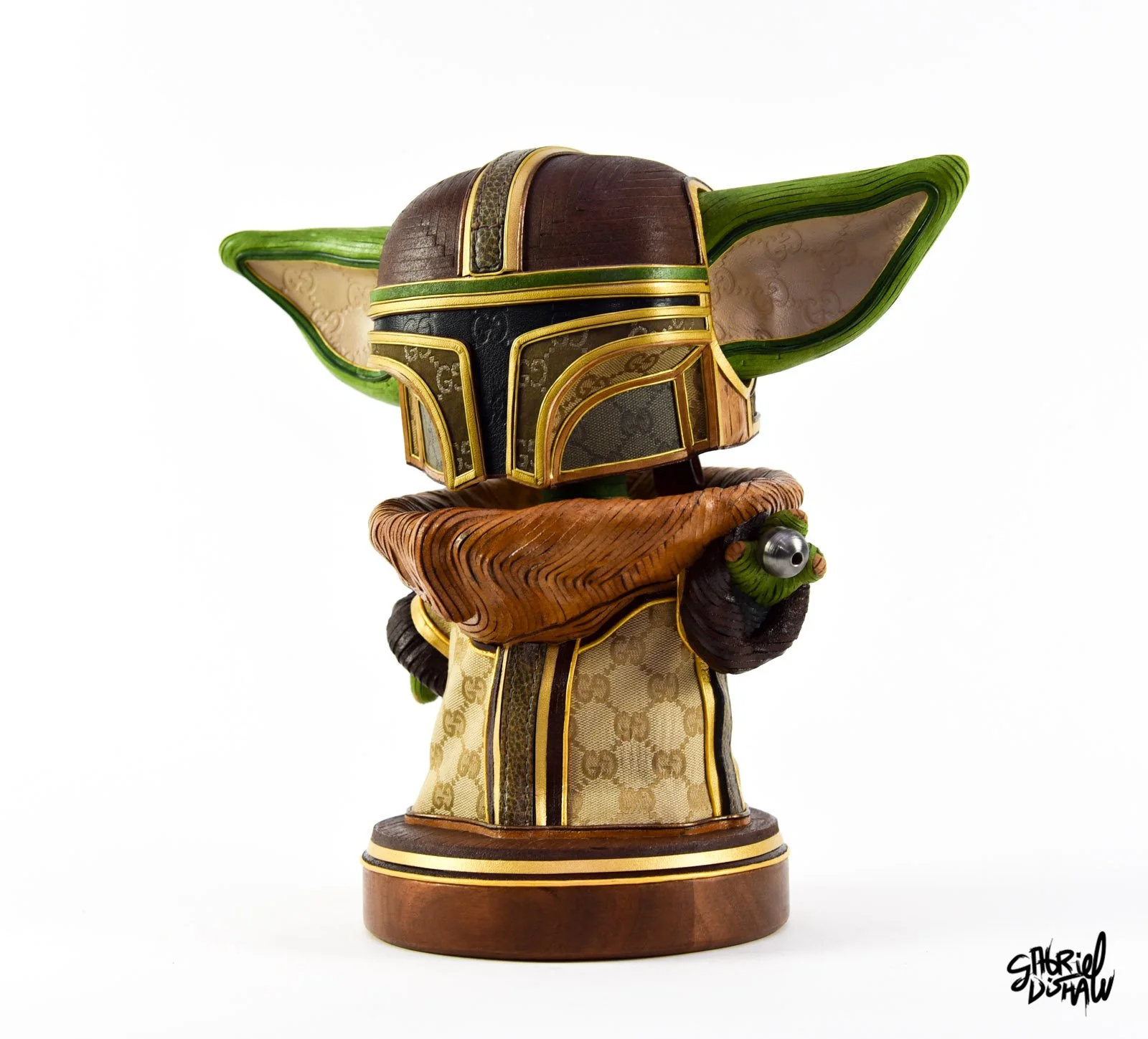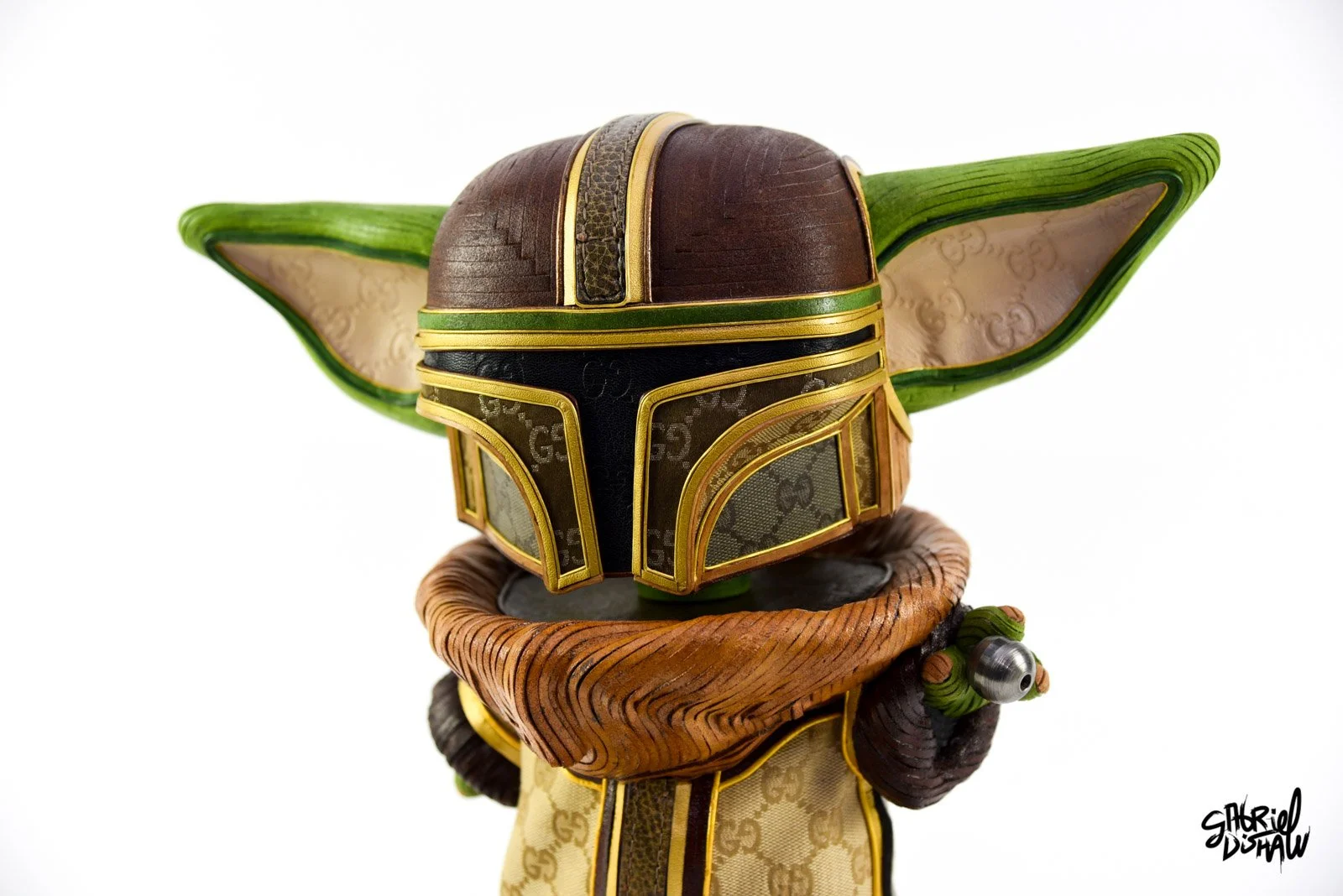 Grogucci Beskar - expands Gabriel Dishaw’s Grogucci series with a bold Mandalorian-inspired twist. Handcrafted from authentic upcycled Gucci materials and found components, this sculpture fuses Grogu’s innocence with the strength and symbolism of Beskar armor