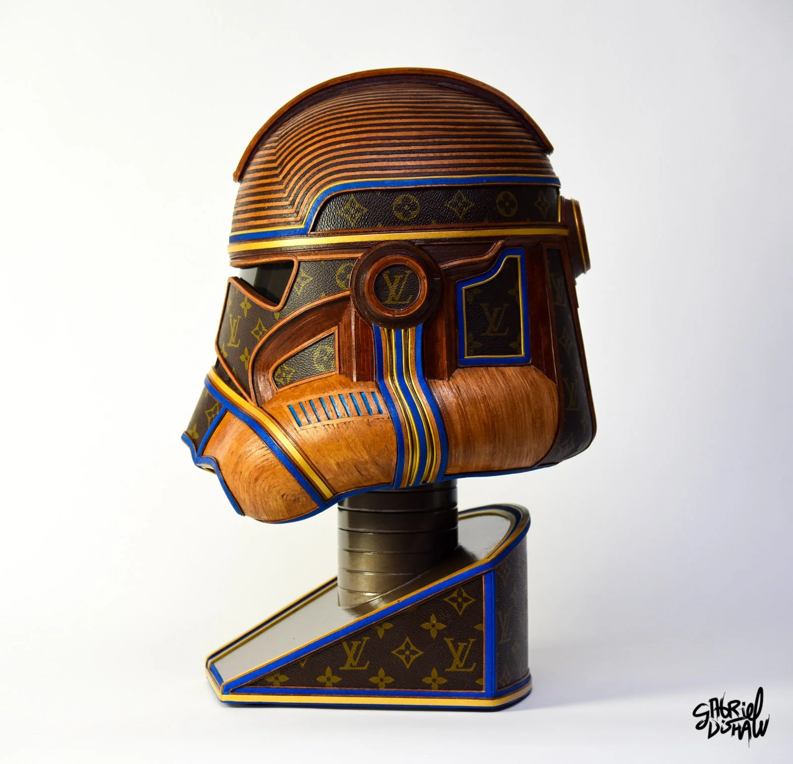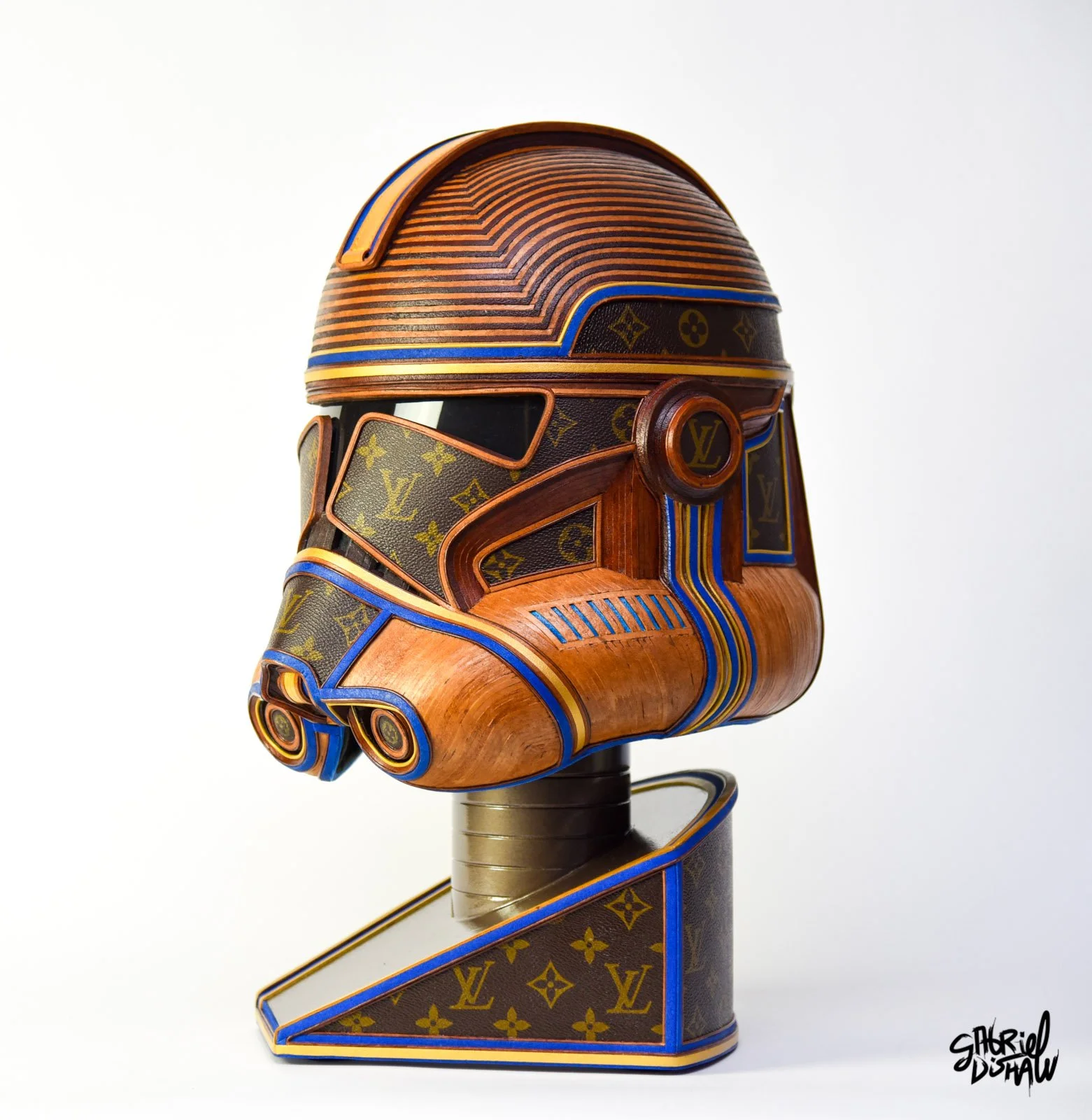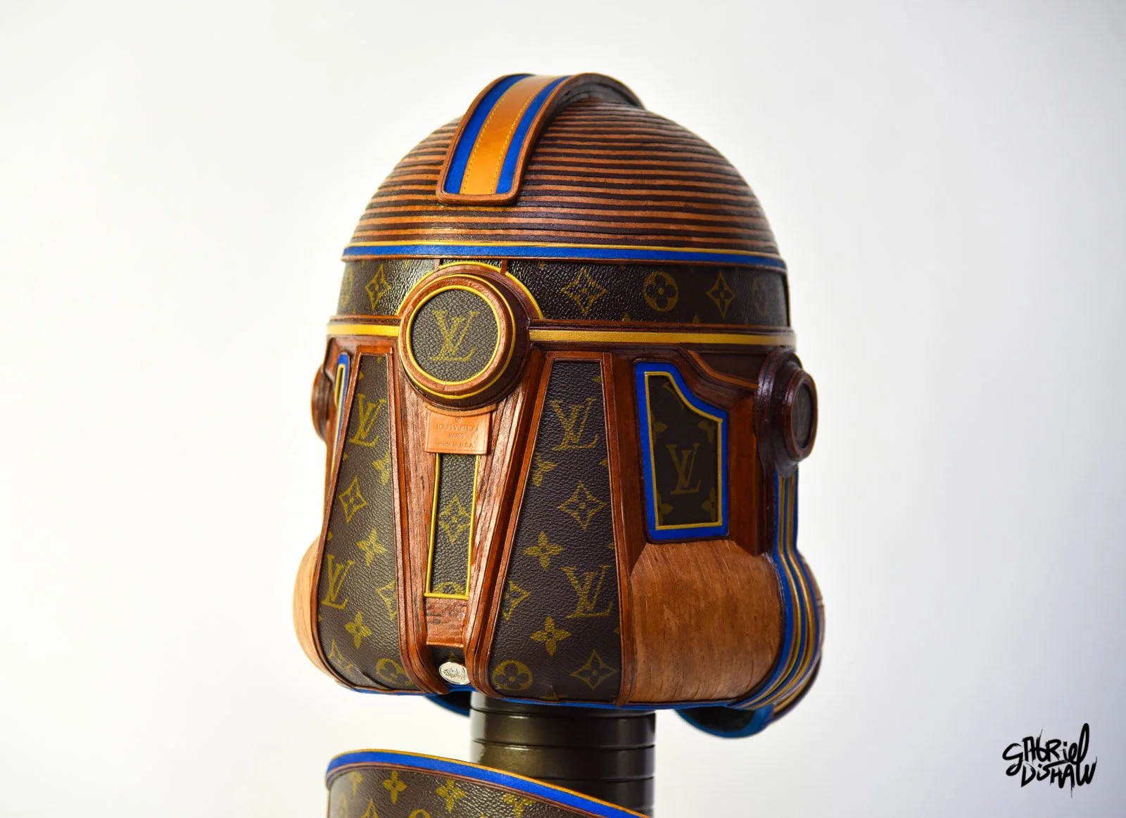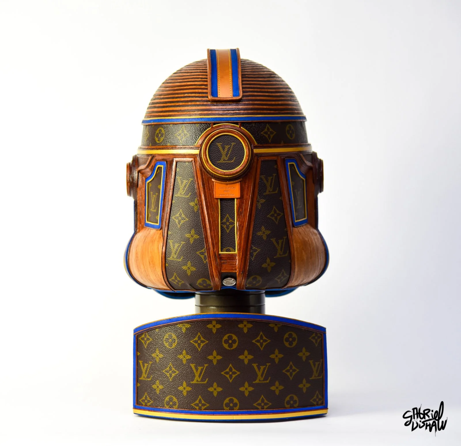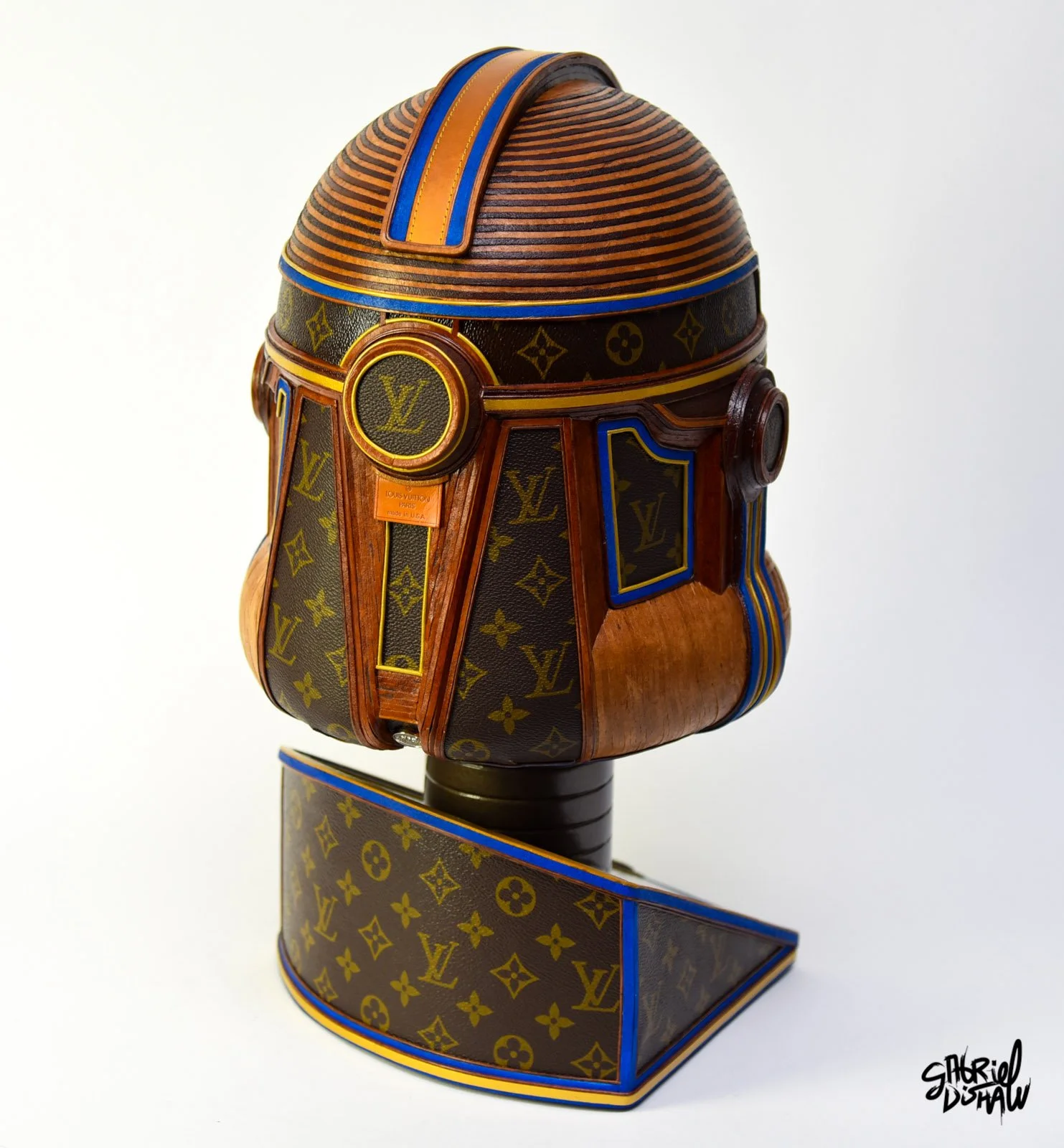 Clone Trooper LV - This helmet was inspired/modeled after the Clone Troopers from the Clone Wars. This piece was created using vintage Louis Vuitton luggage, purses, and other upcycled materials.