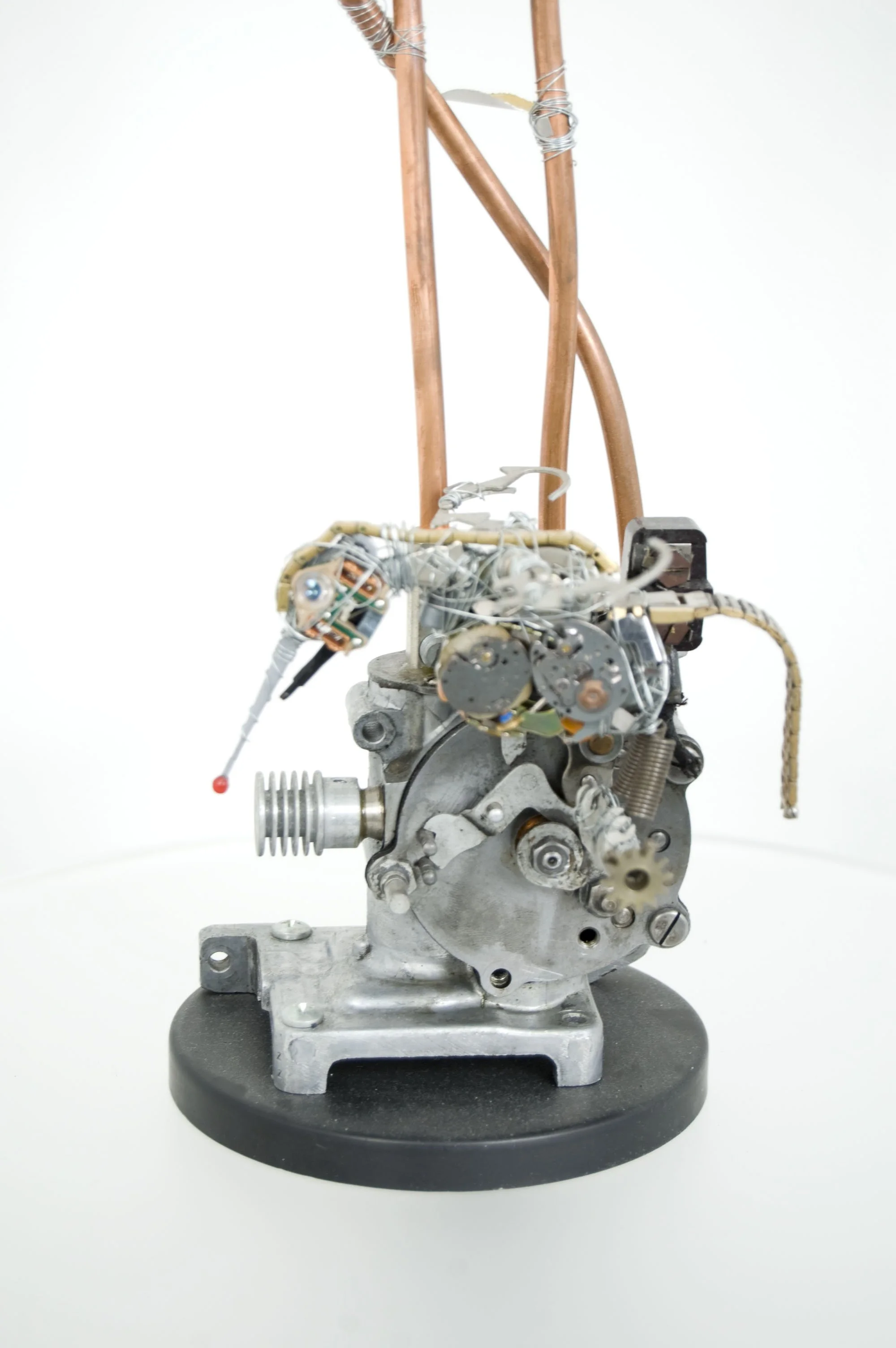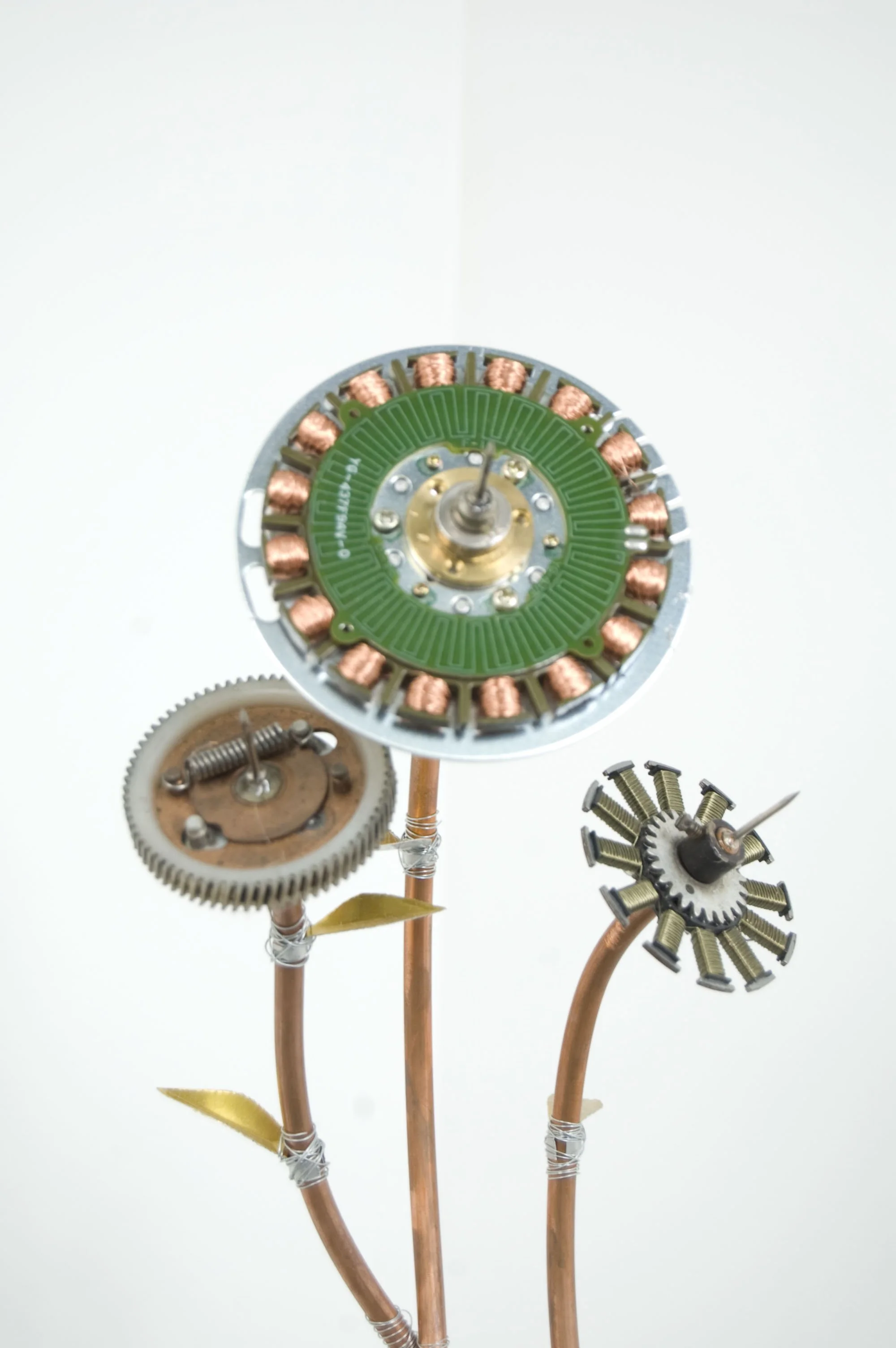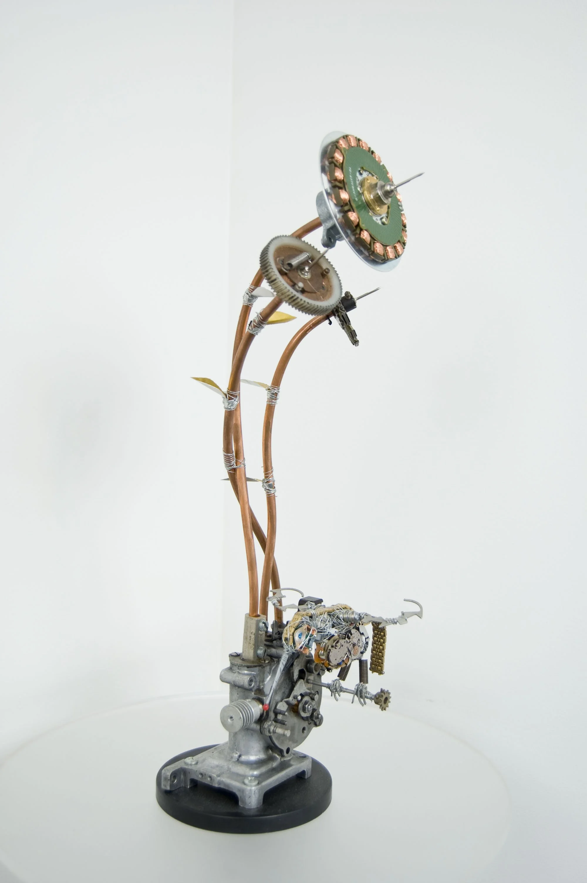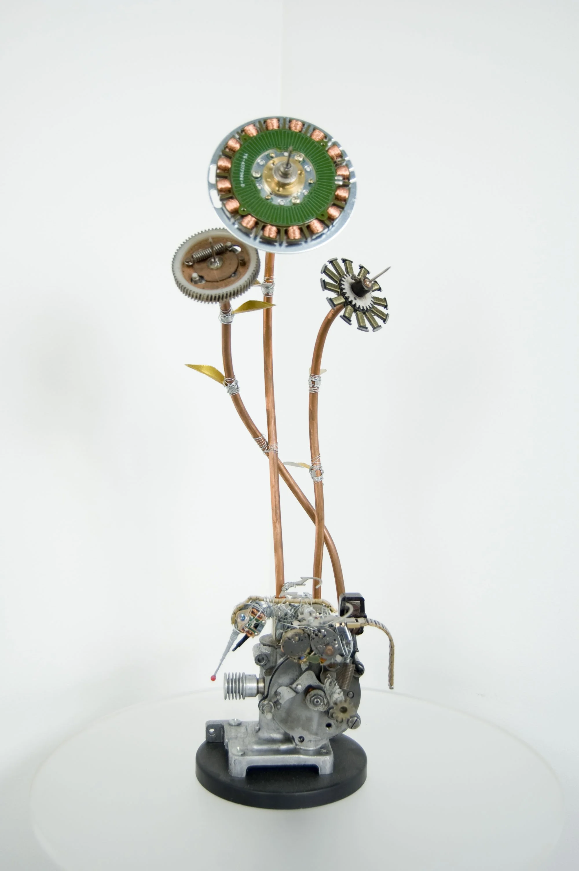 Is part of a series of Flower Sculptures that I explored. My favorite part of this piece is the attached motor. It works as the root system and gives the bird a place to rest.