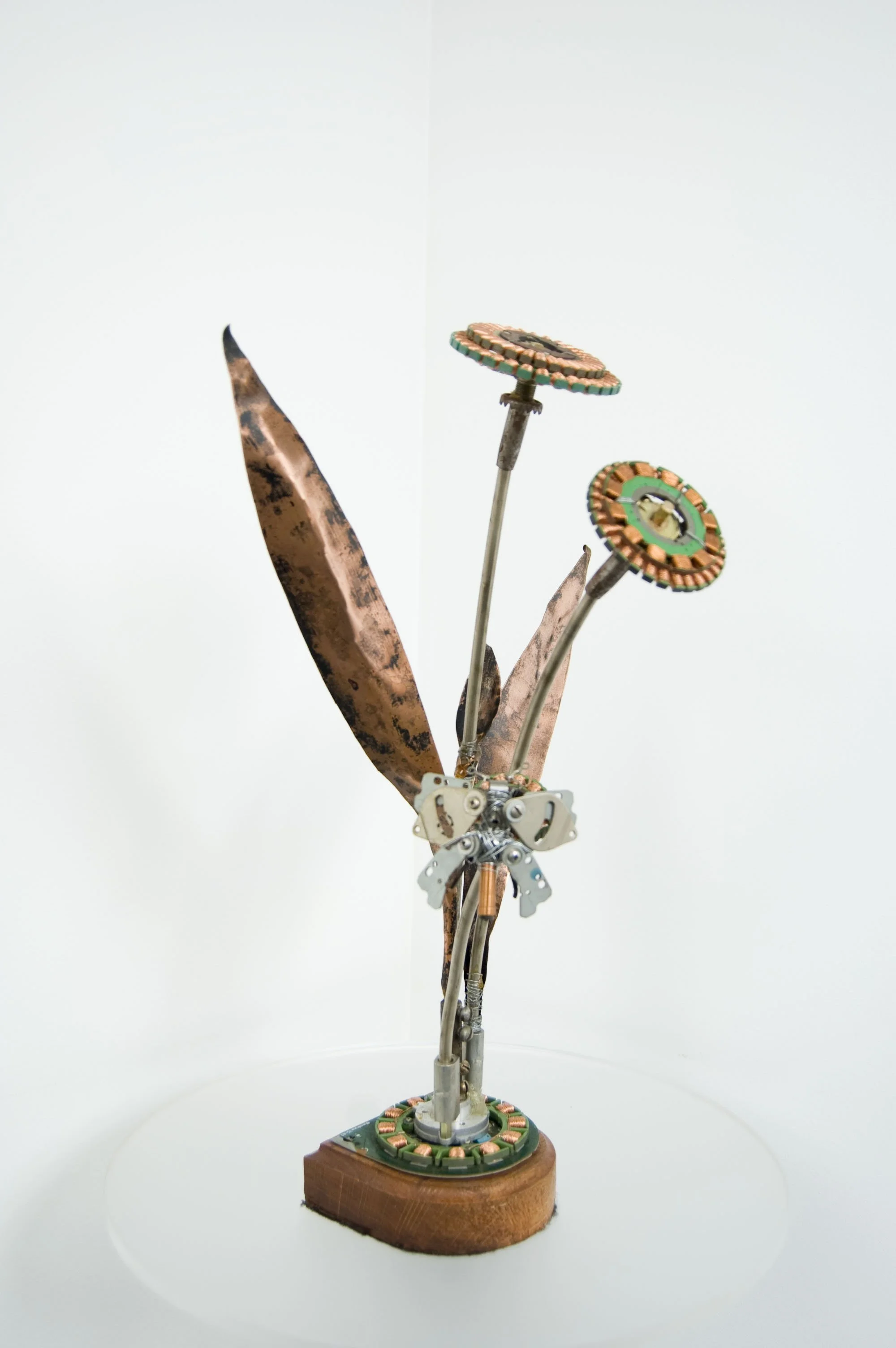 Created very early on. This piece is a continuation of a series of sculptures modeled after a flower. I utilized components from hard drives, metal tubing and copper sheet. I created the base out of oak with help from Andy Bauman.