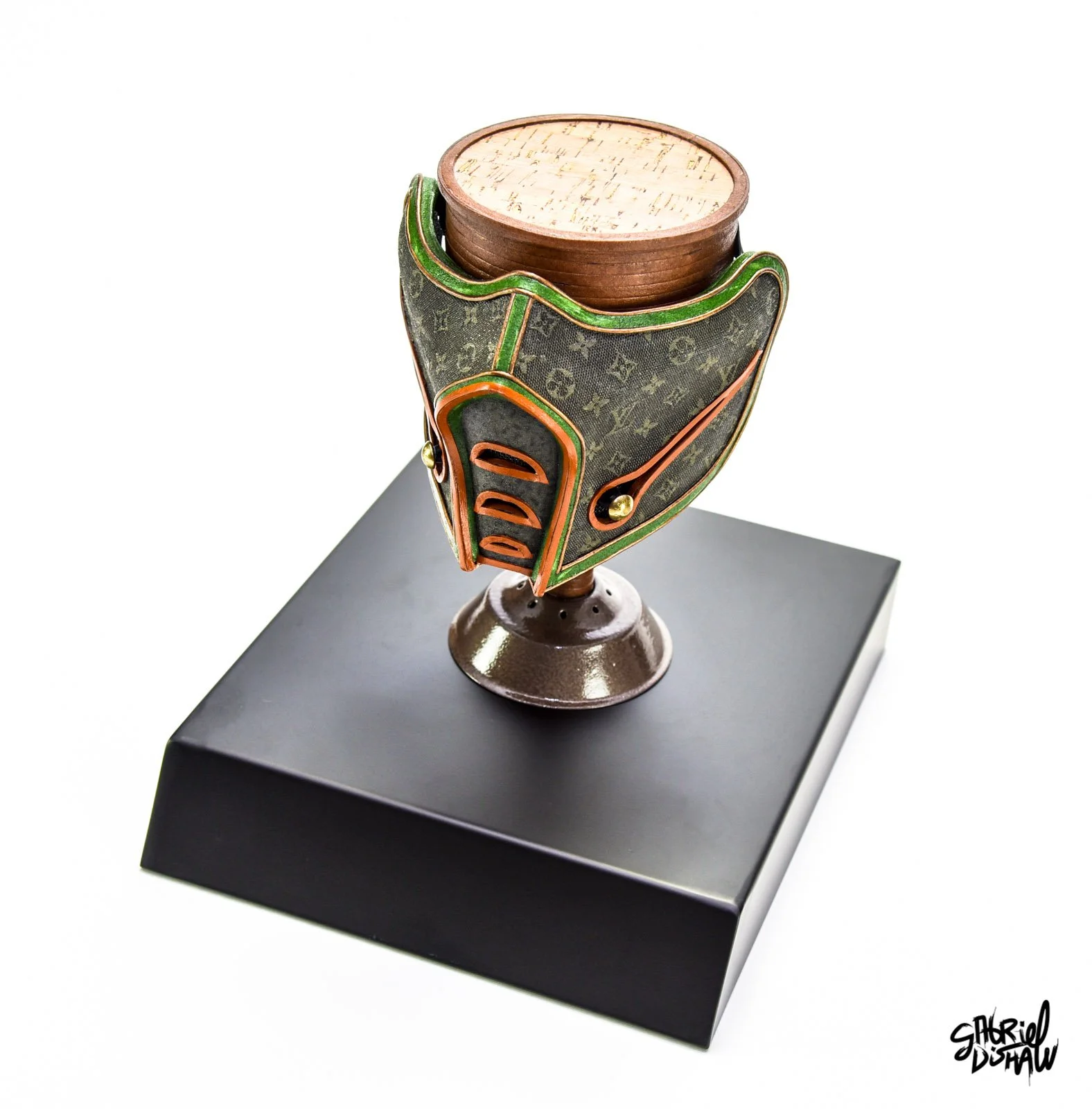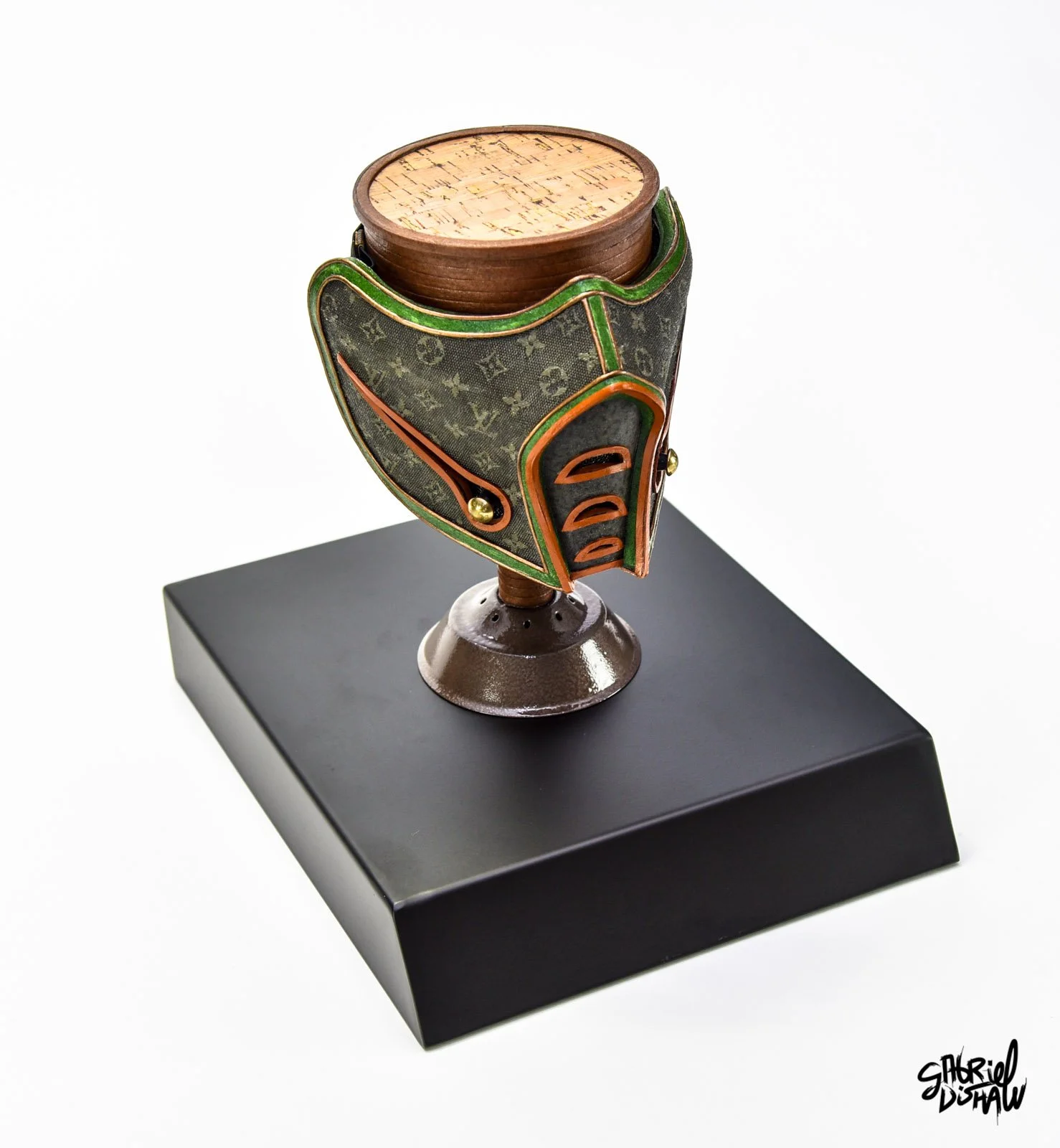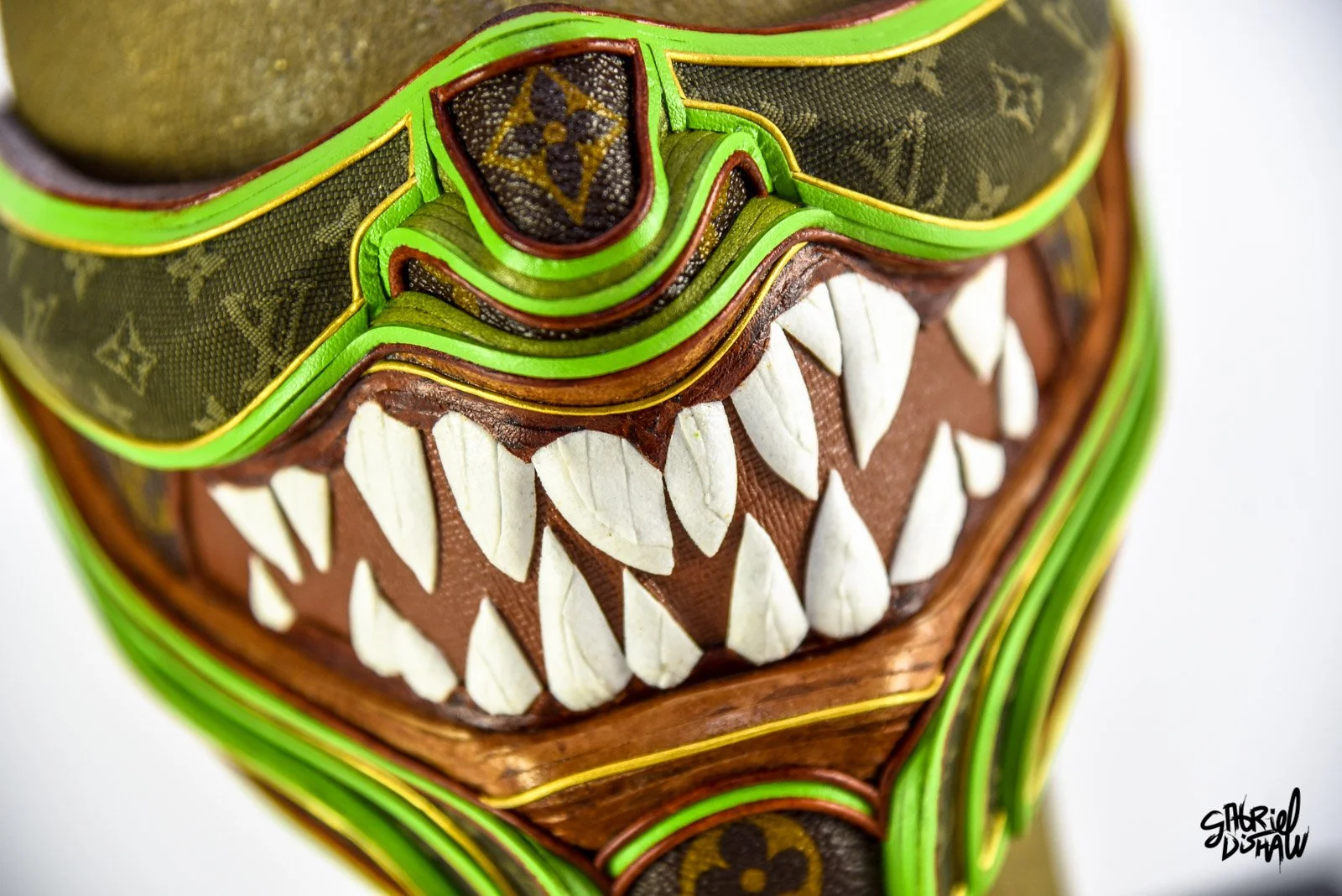 Lord Louis Drakkon - was created by Gabriel Dishaw as a special commission for Jason David Frank, the legendary actor who brought Lord Drakkon and the original Green Ranger to life. Handcrafted using authentic upcycled Louis Vuitton materials and reclaimed components, this sculpture blends the world of Power Rangers with couture craftsmanship.