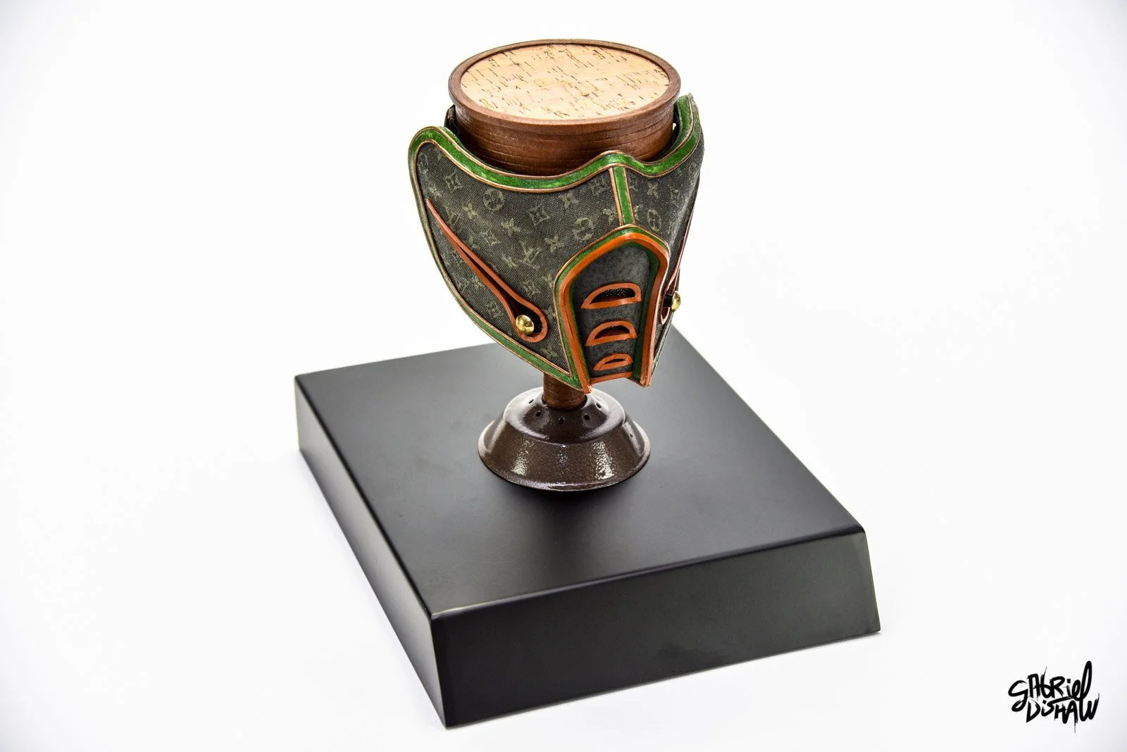 Created through a collaboration with MKKollective, this LV-Inspired Sai was custom-designed for Megan Thee Stallion, merging the worlds of hip-hop, gaming, and luxury craftsmanship. Handcrafted by Gabriel Dishaw using authentic upcycled Louis Vuitton materials and reclaimed components, the sculpture embodies empowerment, creativity, and reinvention.