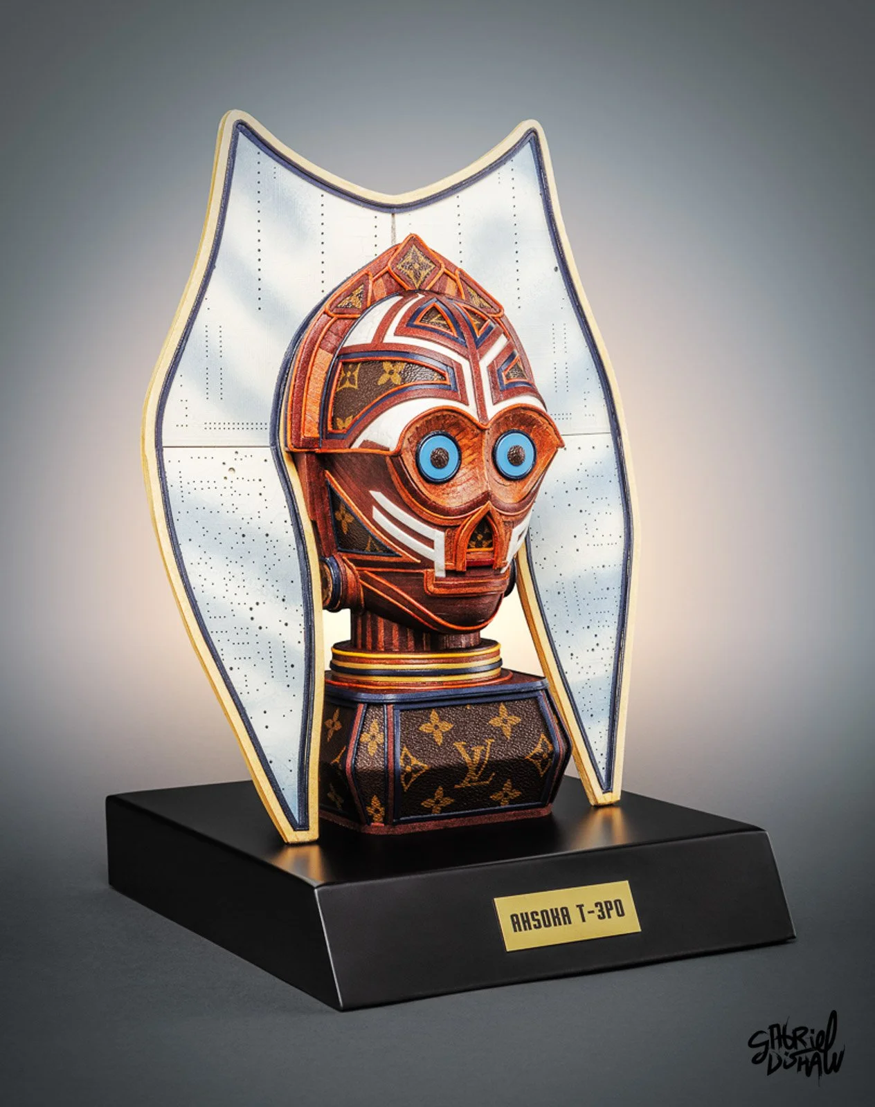 Ahsoka T-3PO - is a one-of-a-kind Star Wars mashup that merges the wisdom and resilience of Ahsoka Tano with the iconic form of C-3PO. Handcrafted by Gabriel Dishaw using reclaimed e-waste and found components, this sculpture explores duality — the meeting of emotion and logic, the organic and the mechanical.