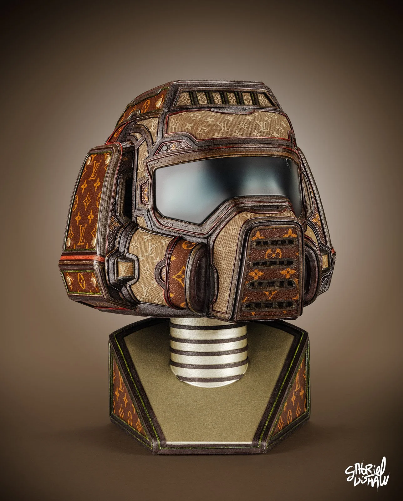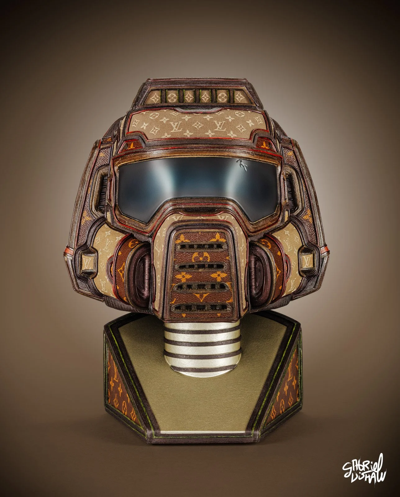 Doom Slayer LV - reimagines the legendary hero from the Doom video game series through the lens of luxury fashion and sustainability. Handcrafted by Gabriel Dishaw using authentic upcycled Louis Vuitton materials and found components.