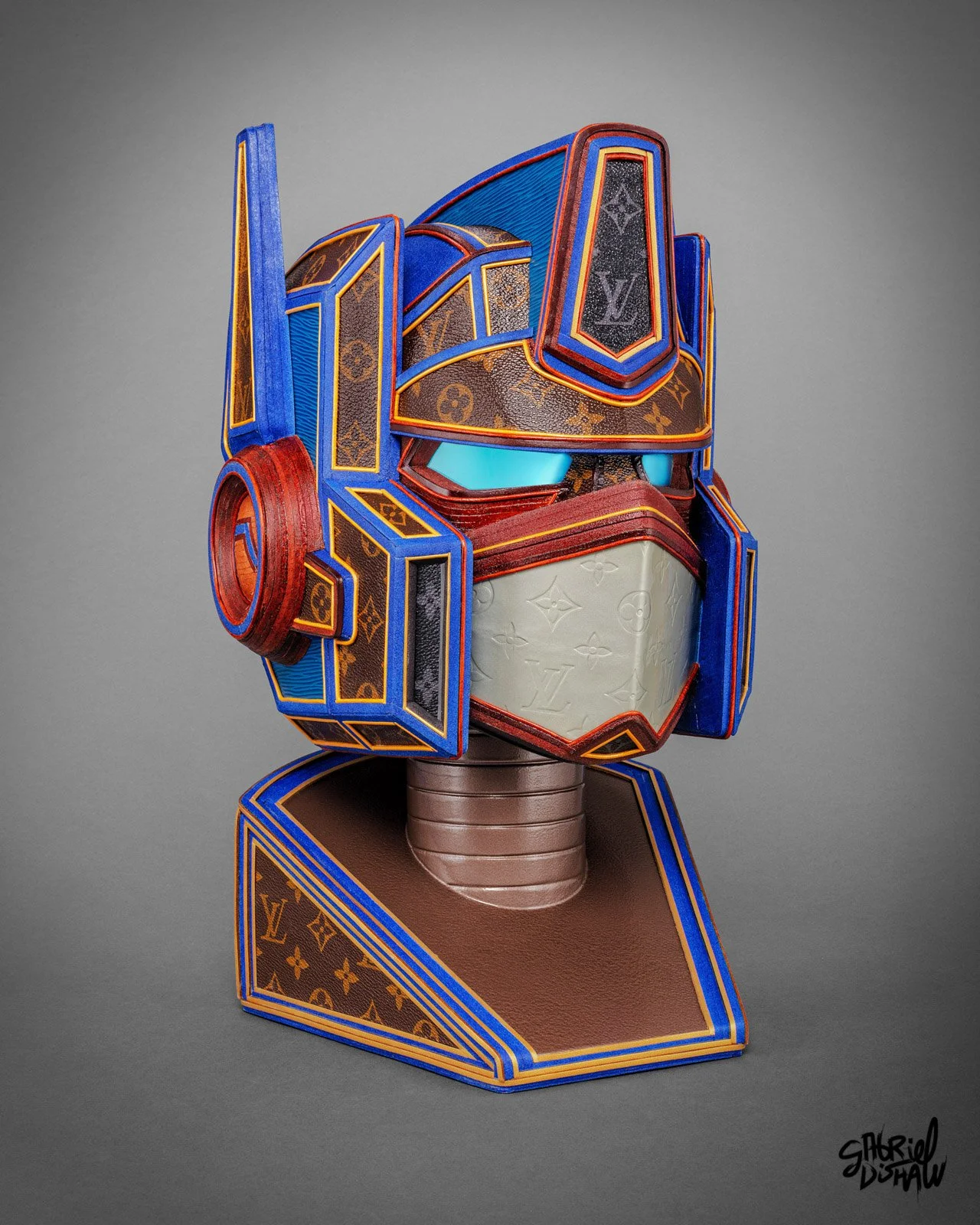 Optimus Prime LV - reimagines the heroic leader of the Autobots through the fusion of craftsmanship, sustainability, and luxury fashion. Handcrafted by Gabriel Dishaw using authentic upcycled Louis Vuitton materials and found components, this sculpture transforms the legendary Transformer into a couture-inspired collectible.