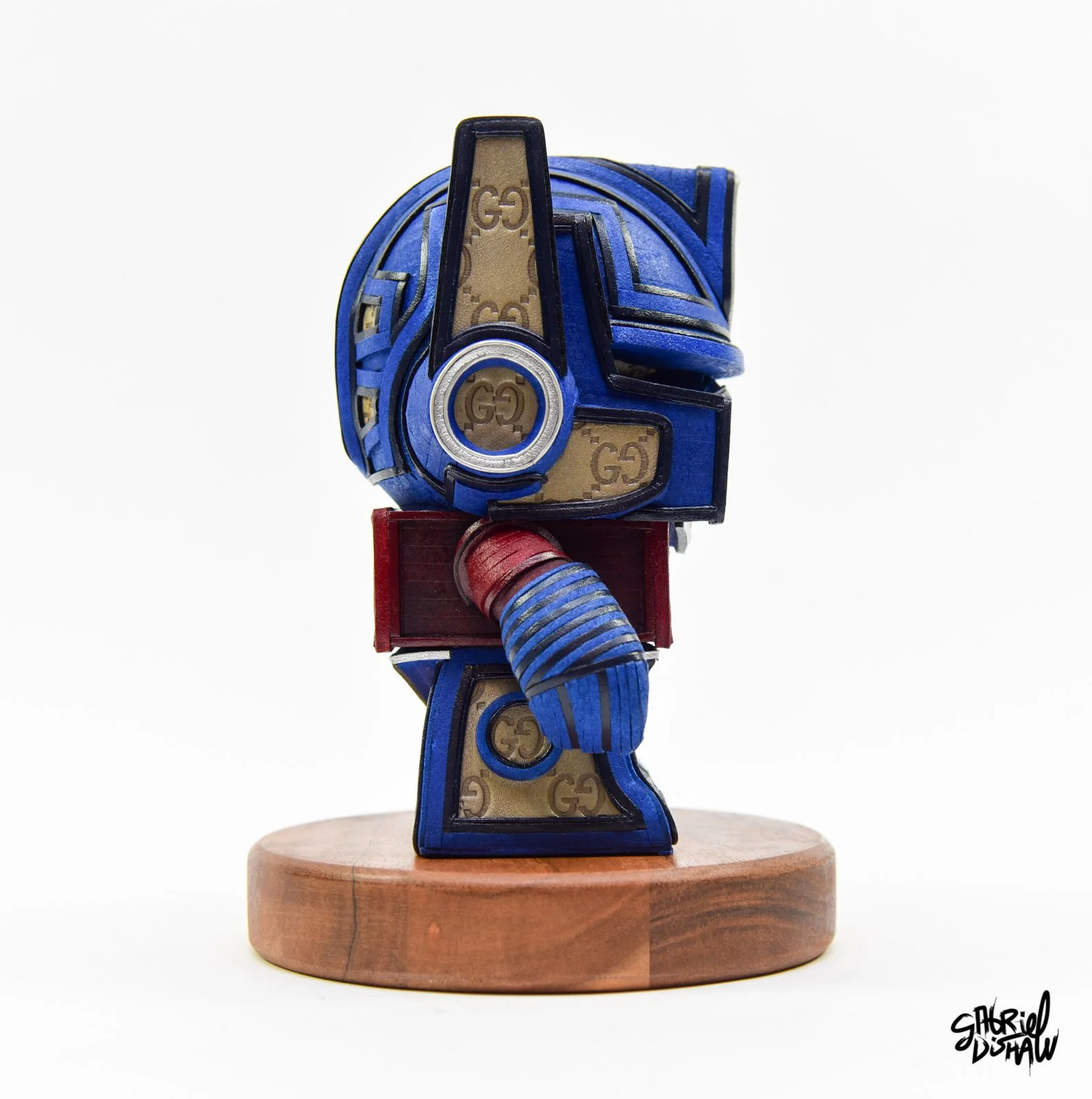 Prime Gucci - reimagines the legendary leader of the Autobots through the artistry of upcycling and luxury design. This small, pop-sized figure transforms Optimus Prime into a couture collectible, handcrafted by Gabriel Dishaw using authentic upcycled Gucci materials and found components.
