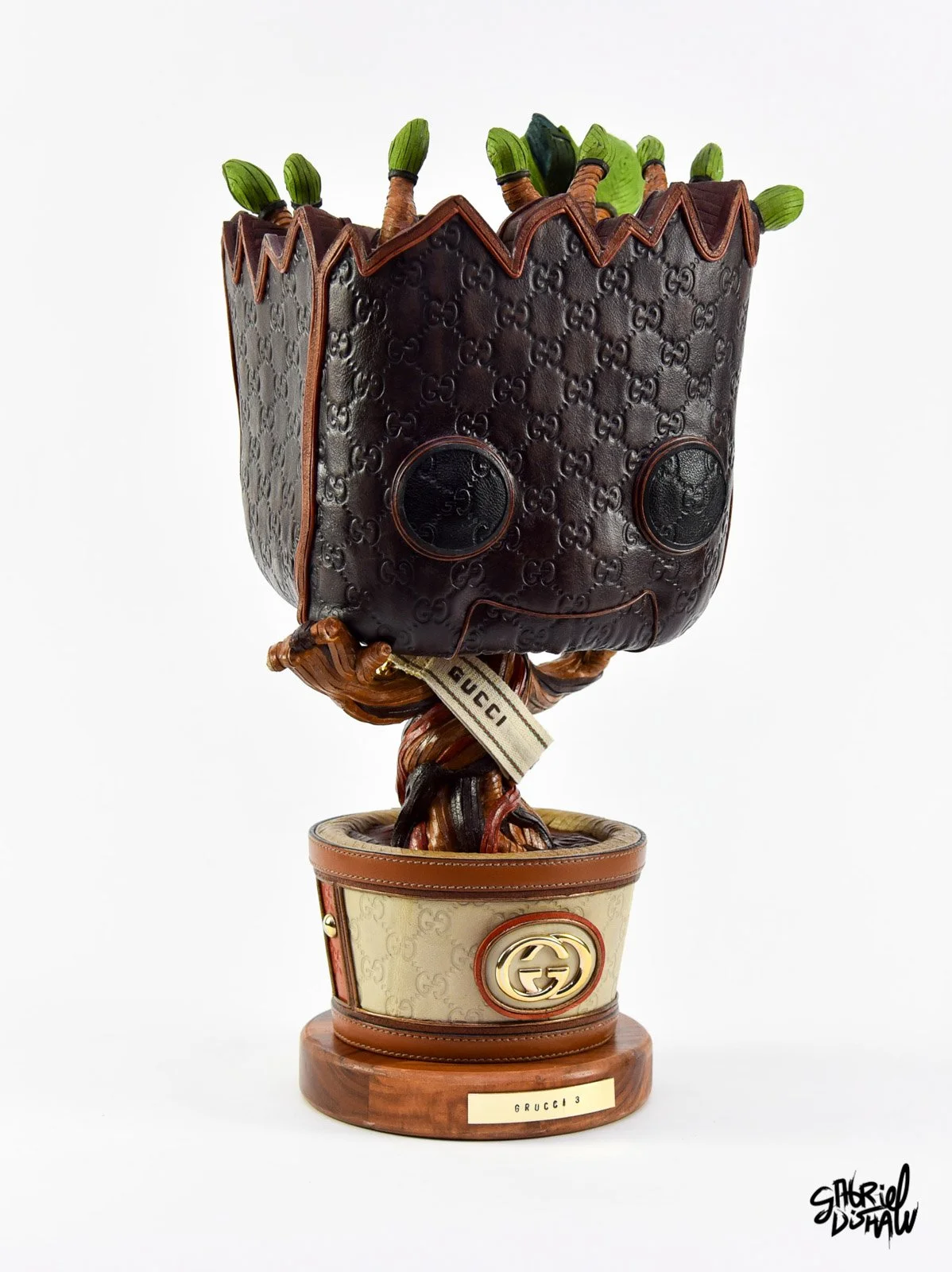 Grucci Three - continues Gabriel Dishaw’s beloved Gucci-inspired Groot series, celebrating Baby Groot in his regrowing, potted form. Handcrafted from authentic upcycled Gucci materials and found components, this sculpture blends organic charm with couture craftsmanship.