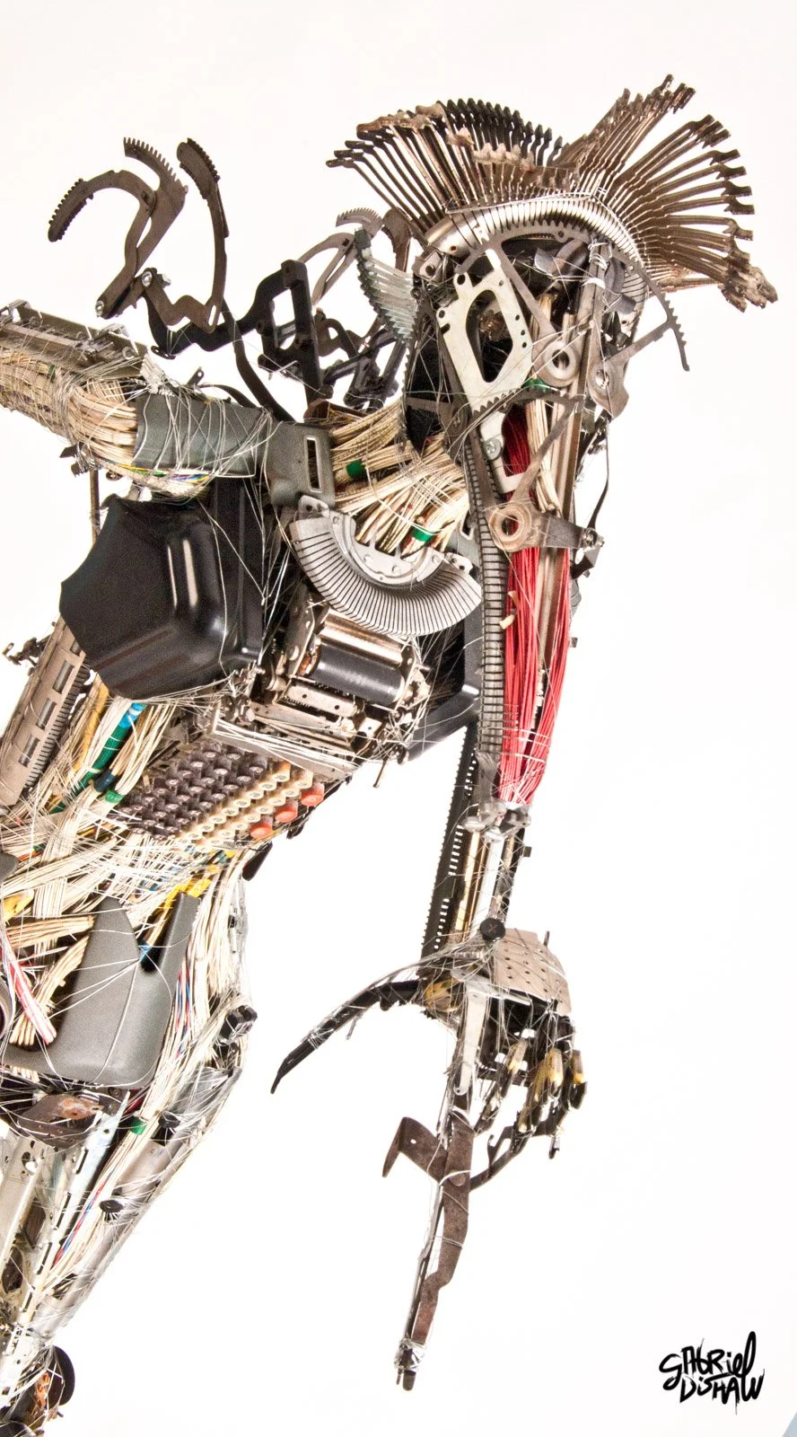 MATERIALS USED: adding machines, typewriter parts, airplane wire, computer parts, and copy machine components.