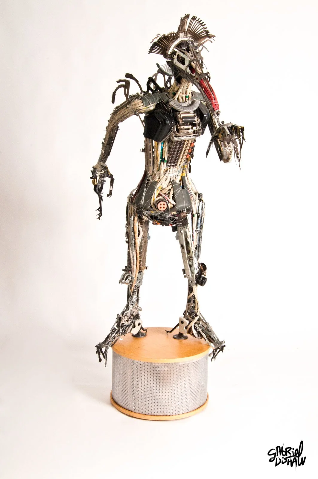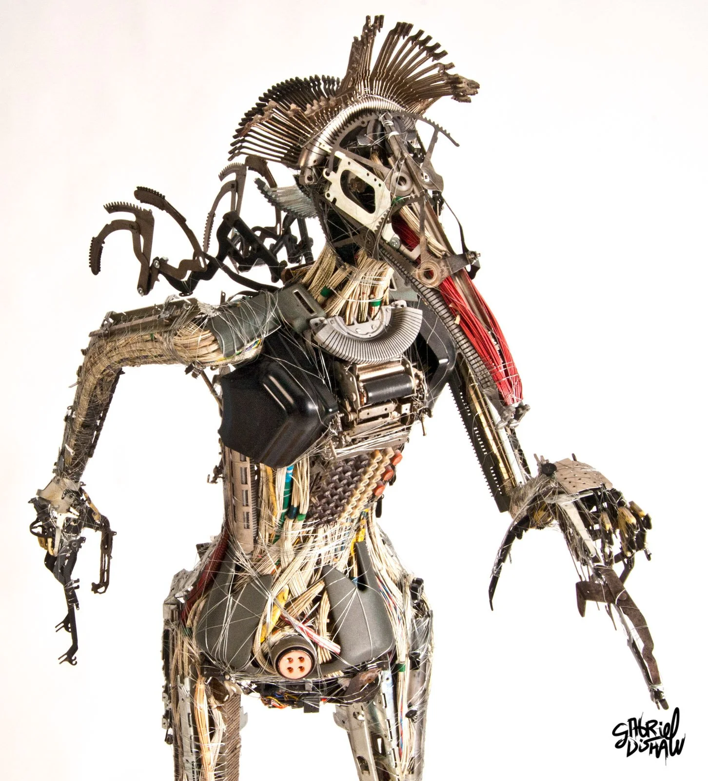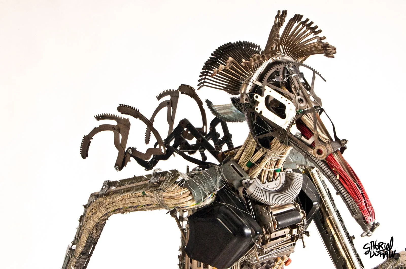 Lecturing Bird embodies movement and personality through the transformation of found materials into expressive form. Created entirely from upcycled and reclaimed objects, this figurative sculpture captures the posture and presence of a bird mid-discussion—animated, confident, and full of life. By blending sustainability with storytelling, this piece celebrates both the artistry of reuse and the individuality found in nature’s character