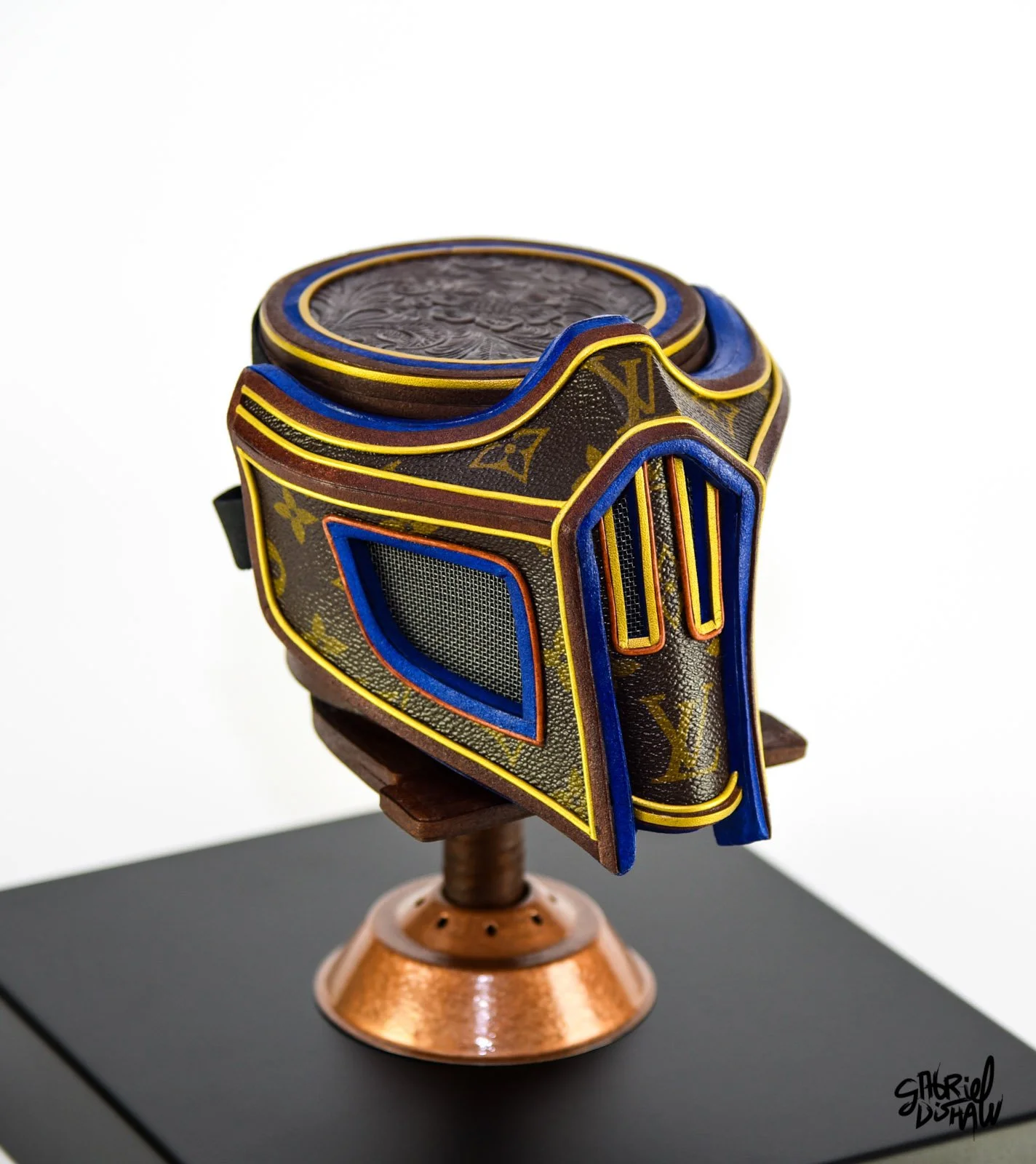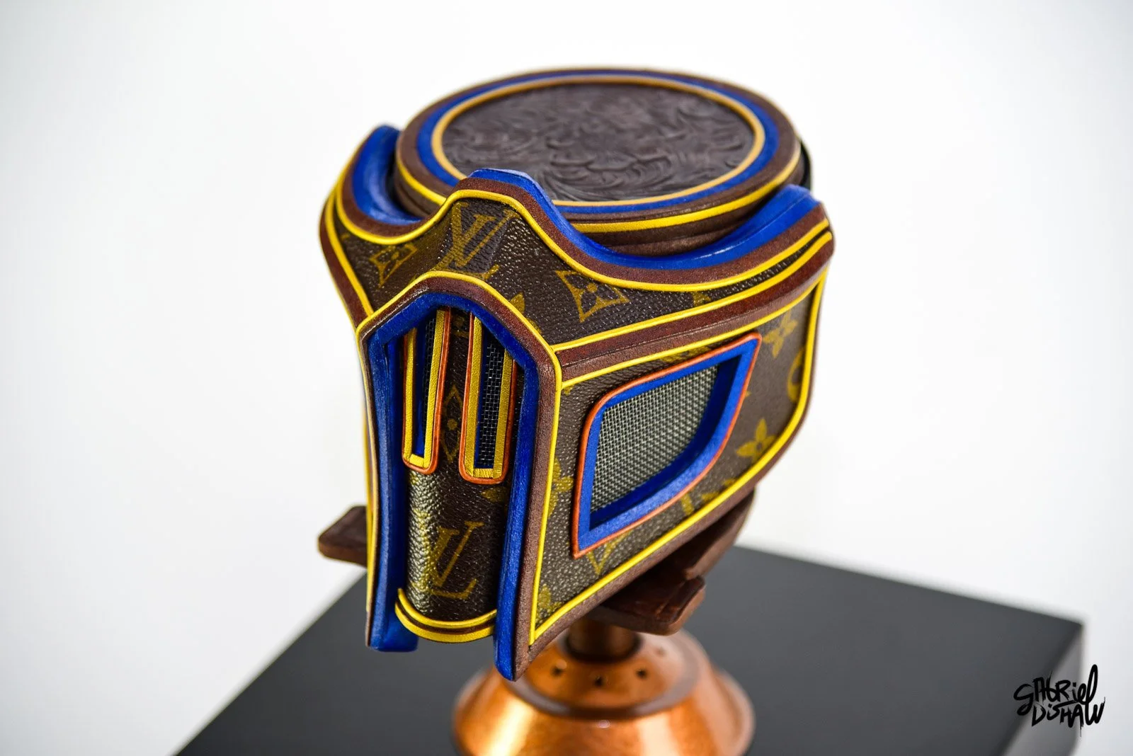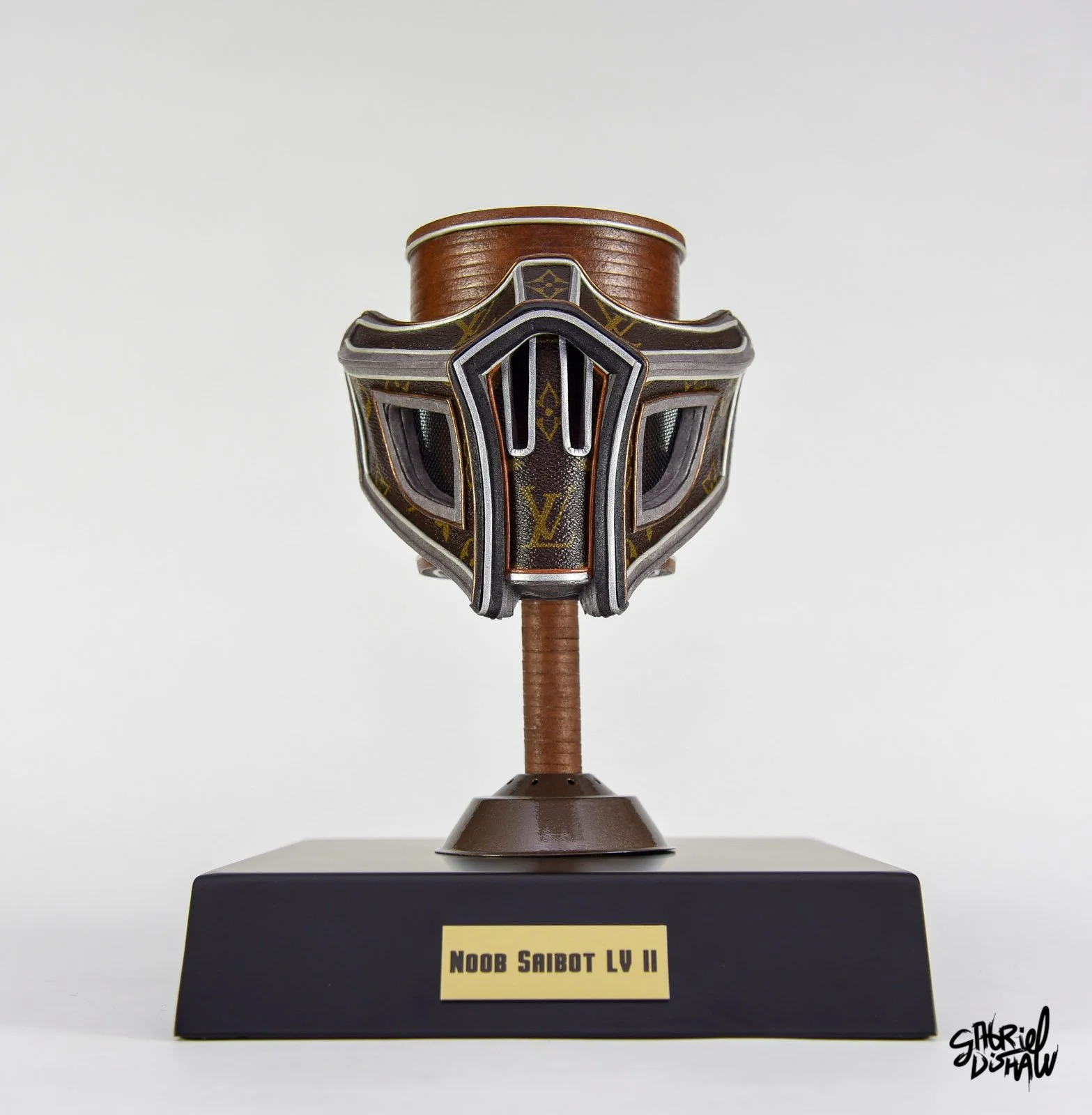 Noob Saibot Vuittonhelmet reimagines one of Mortal Kombat’s most enigmatic and shadowed warriors through the artistry of luxury upcycling. Handcrafted by Gabriel Dishaw using authentic vintage Louis Vuitton materials and reclaimed components, this sculpture blends the fighter’s haunting aesthetic with couture craftsmanship.