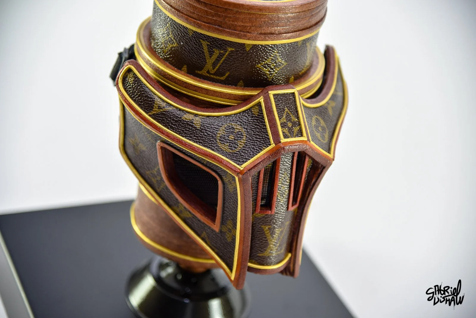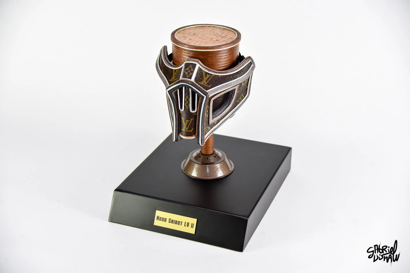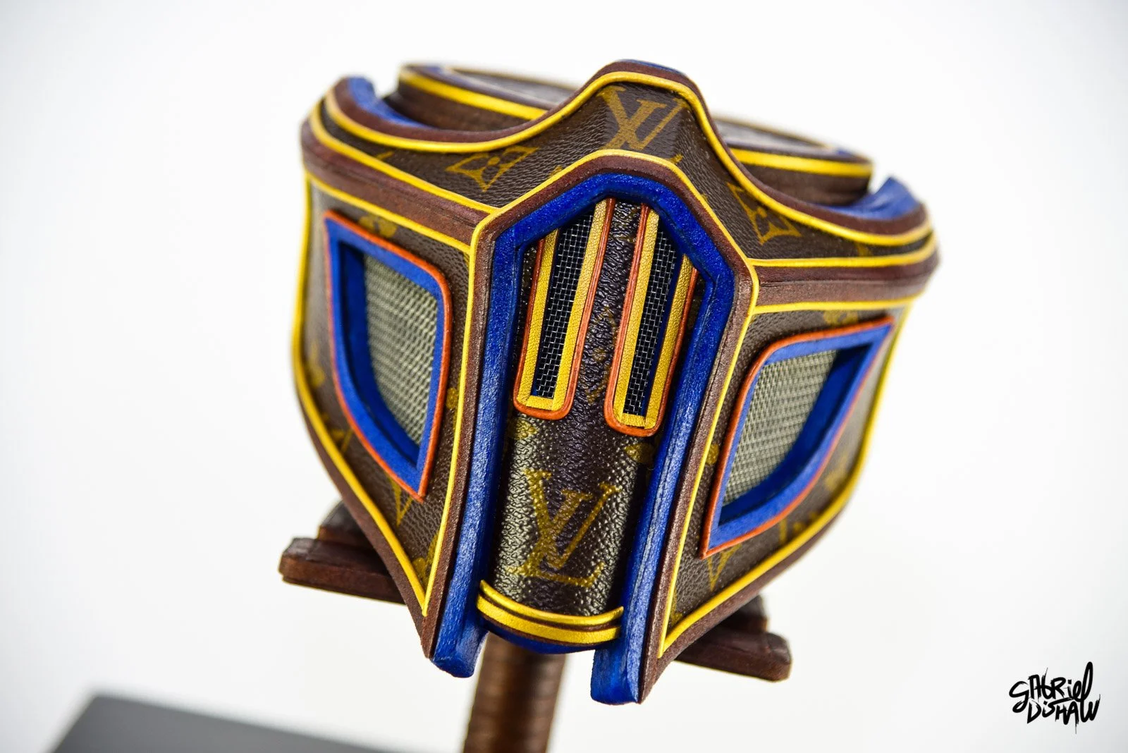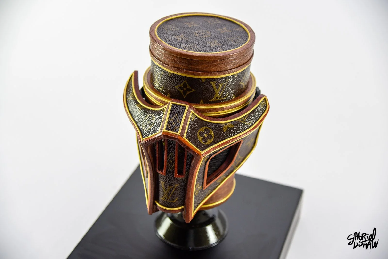 Noob Saibot Vuittonhelmet reimagines one of Mortal Kombat’s most enigmatic and shadowed warriors through the artistry of luxury upcycling. Handcrafted by Gabriel Dishaw using authentic vintage Louis Vuitton materials and reclaimed components, this sculpture blends the fighter’s haunting aesthetic with couture craftsmanship.