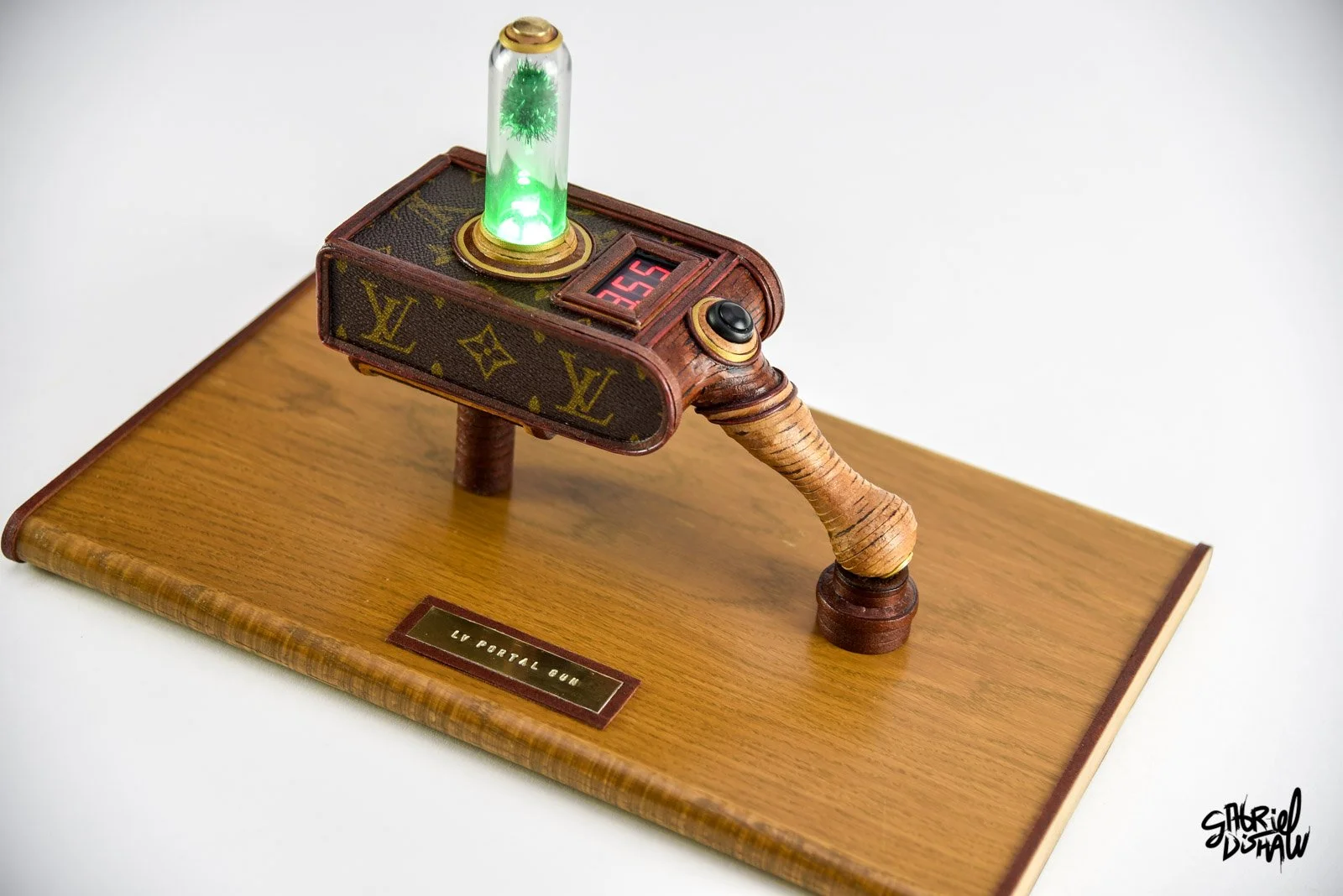 LV Portal Gun - transforms the interdimensional gadget from Rick and Morty into a fusion of luxury design and creative upcycling. Handcrafted by Gabriel Dishaw using authentic upcycled Louis Vuitton materials and found components, this sculpture reimagines the show’s signature technology through a couture lens.