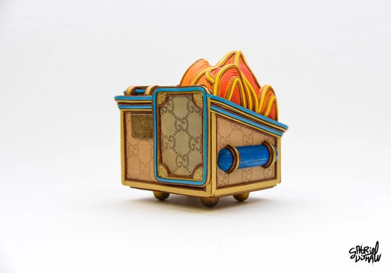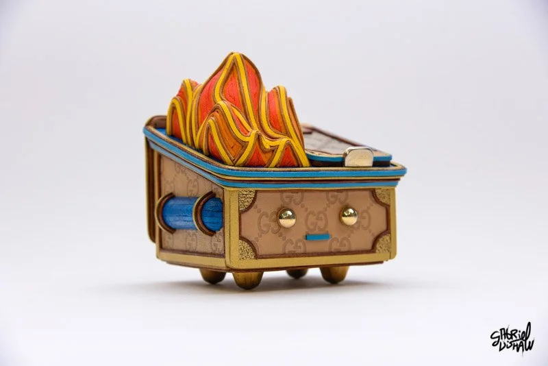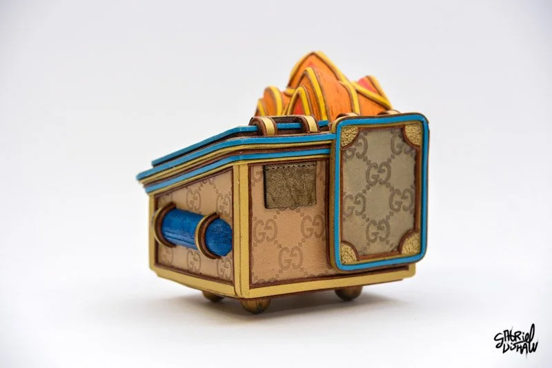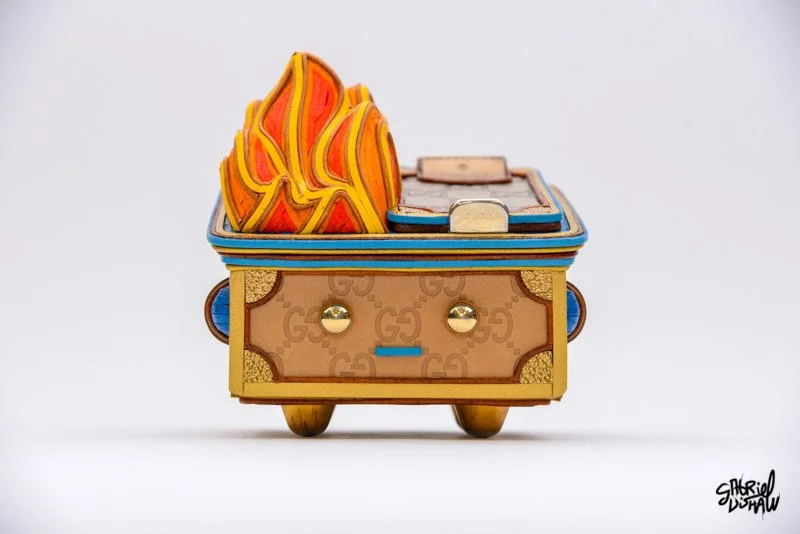 Dumpster Fire Lucci - Drawing inspiration from the iconic Dumpster Fire vinyl toy by 100%soft, I have created a Luxury-inspired version that juxtaposes these two worlds. In the creation of this piece I used authentic upcycled Gucci materials, leathers and other found objects.