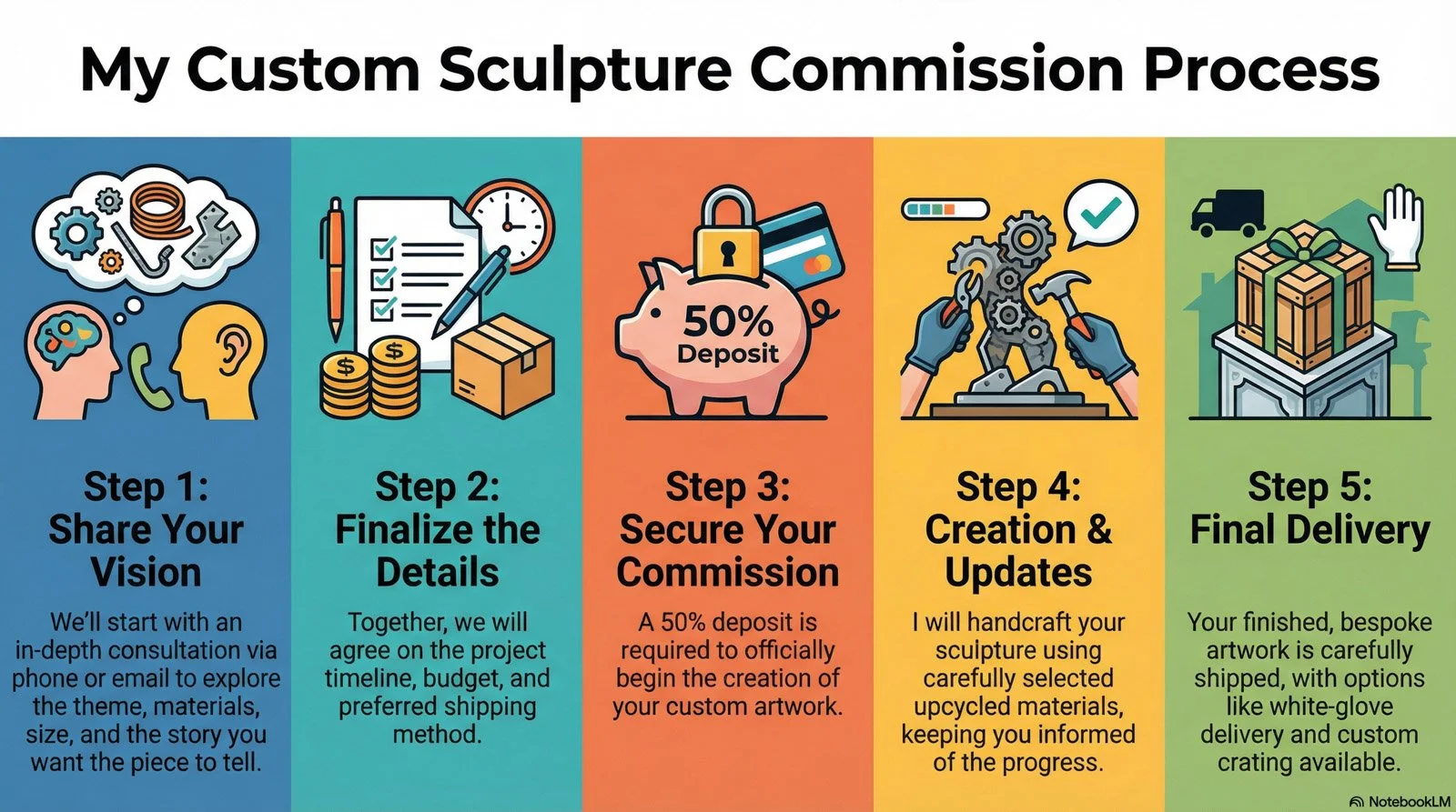 Key logistical details are covered up front: timeline (including important dates and arrival deadlines), budget and payment terms (a 50 % deposit is required), and shipping preferences—from carrier choice to white‑glove delivery and crating for larger works. Throughout the process, Gabriel crafts your one‑of‑a‑kind piece using upcycled materials such as adding machines, typewriters and computer parts, keeping you informed until final delivery.