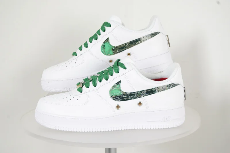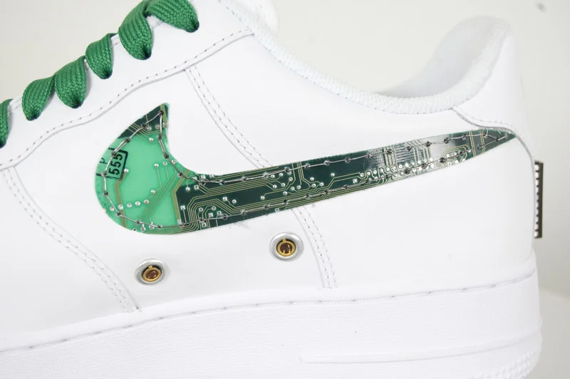 DESCRIPTION AND DETAILS: My first customized shoe series. This shoe is wearable and has had the swoosh customized with circuit boards. In addition accents have been added to the tongue, side wall and heel. The shoe also comes with its very own customized shoe box.