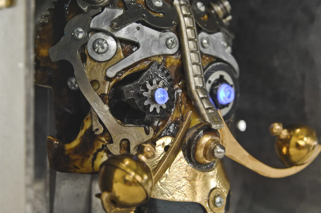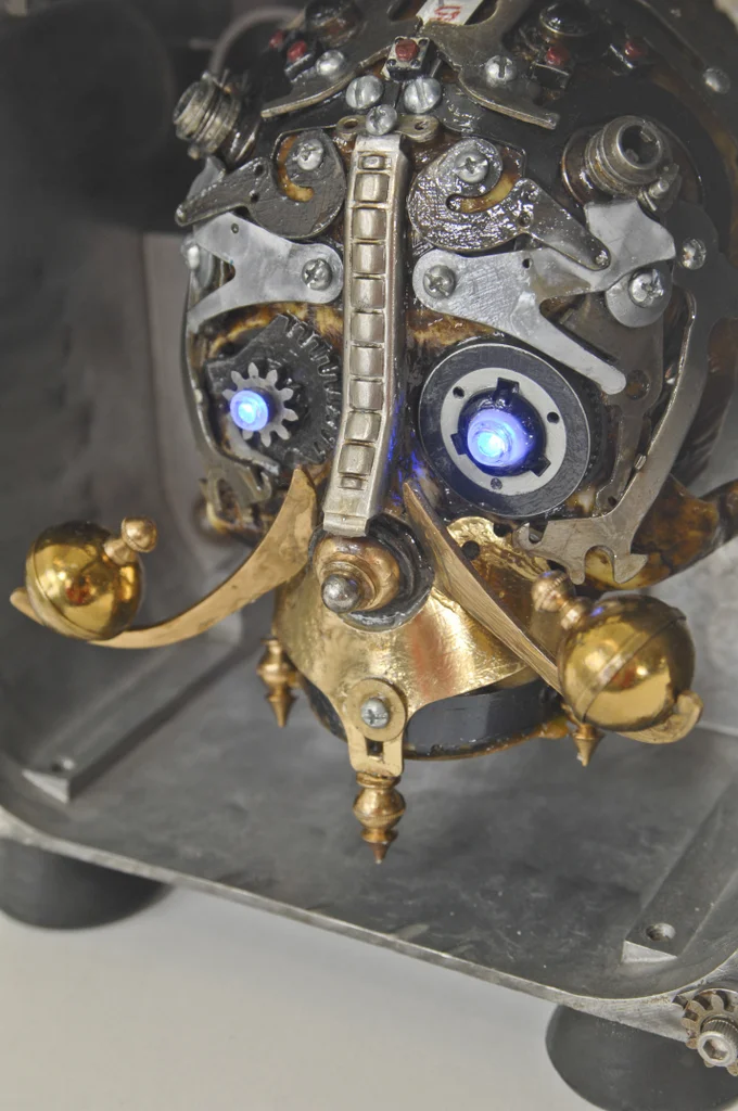 MATERIALS USED: clock parts, metal gears, typewriter components, pyrometer case, led lights, and computer parts.