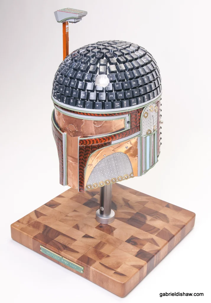 DESCRIPTION AND DETAILS: This piece was created entirely from upcycled materials such as: laptop keyboard keys, computer ram, adding machine parts, computer chips, data cables, speaker wire and a chopping block.