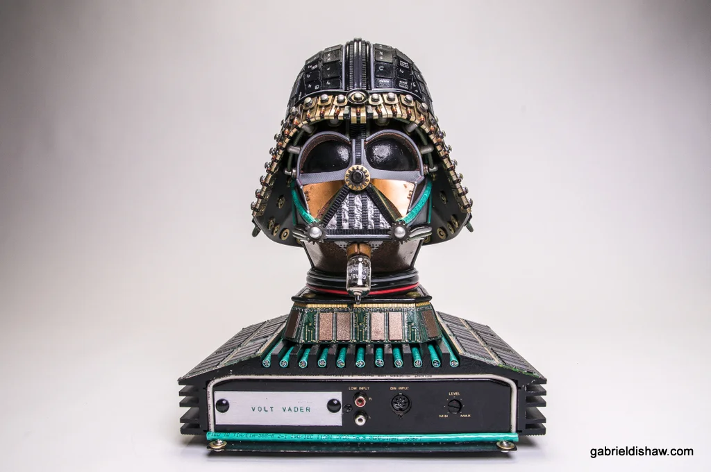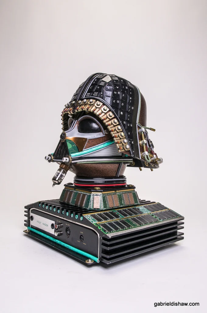 DESCRIPTION AND DETAILS: This piece was created entirely from upcycled materials such as: laptop keyboard keys, airplane pieces, adding machine parts, computer ram, computer chips, data cables and a car amp.